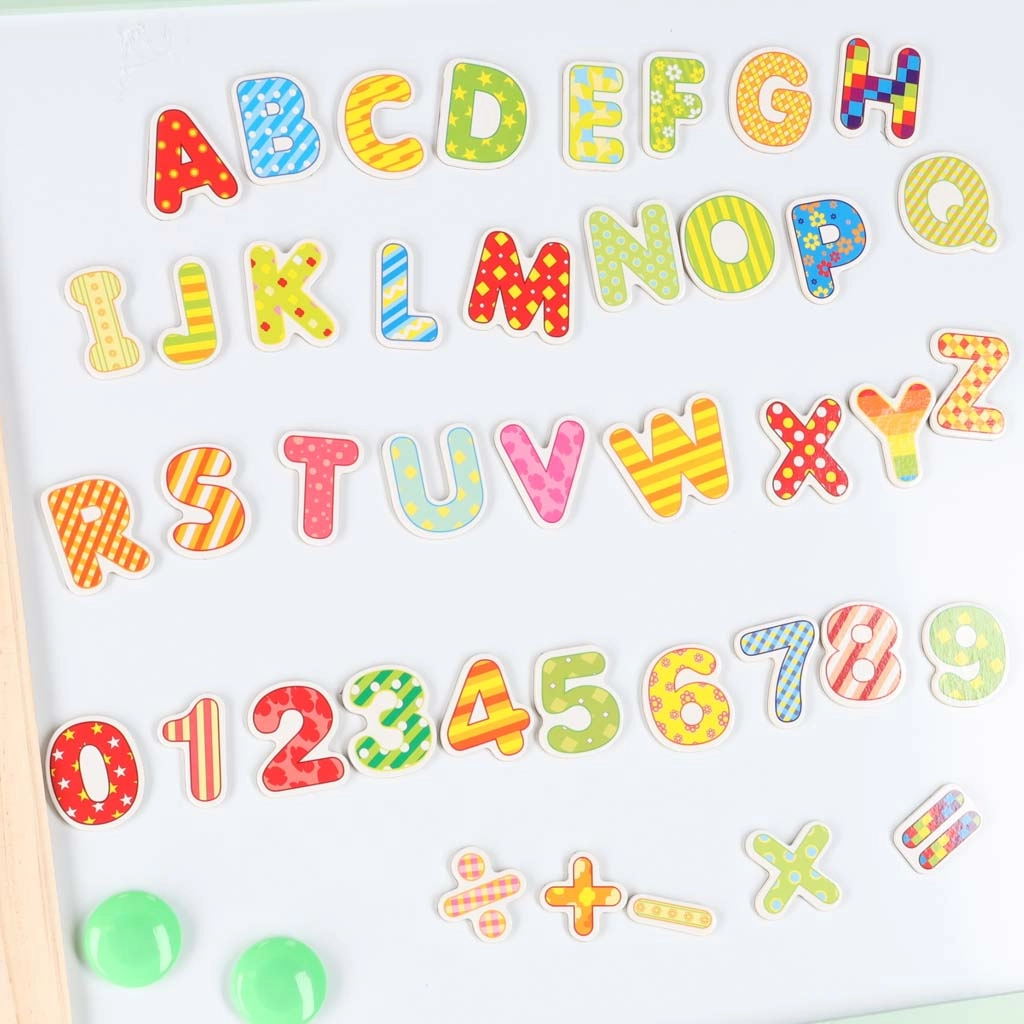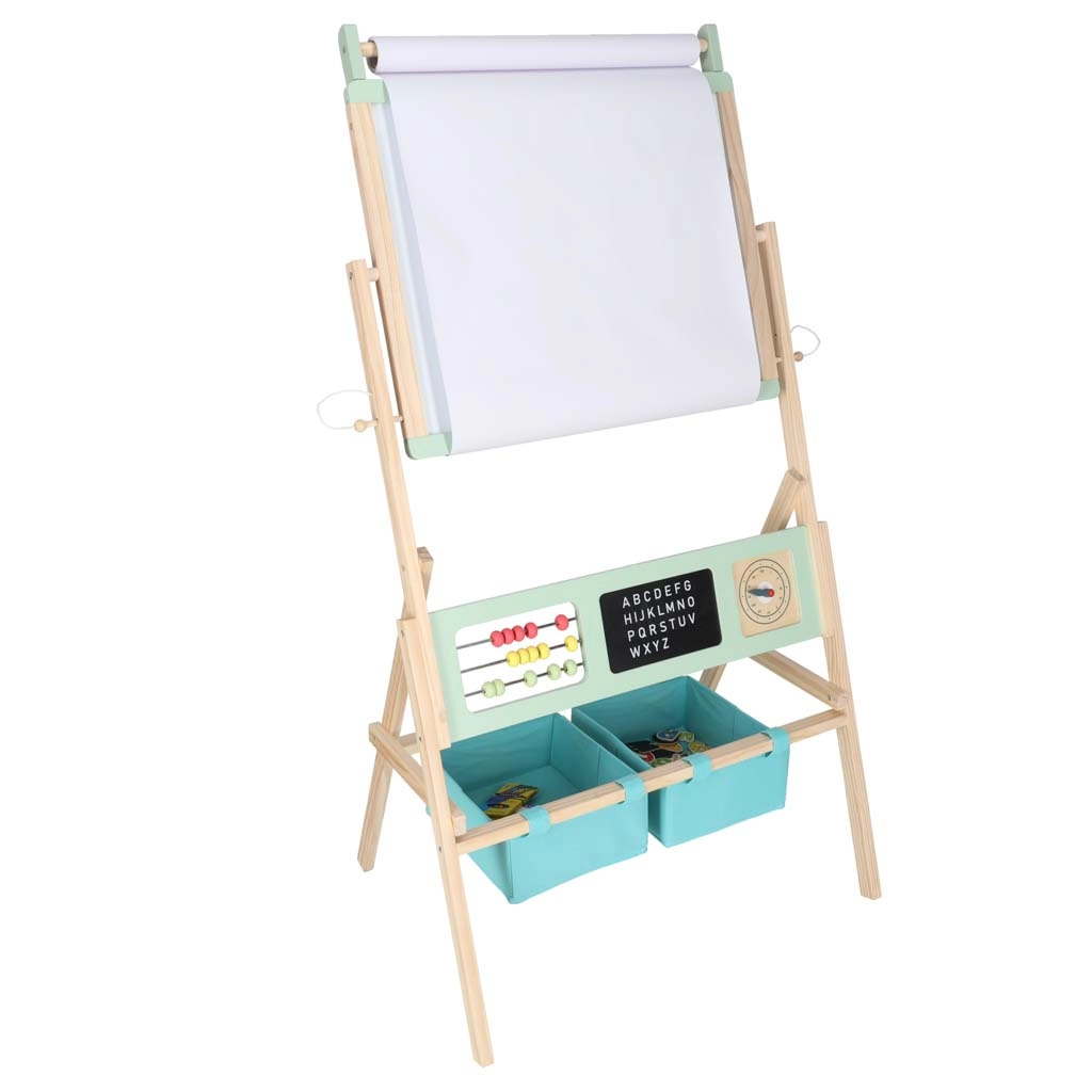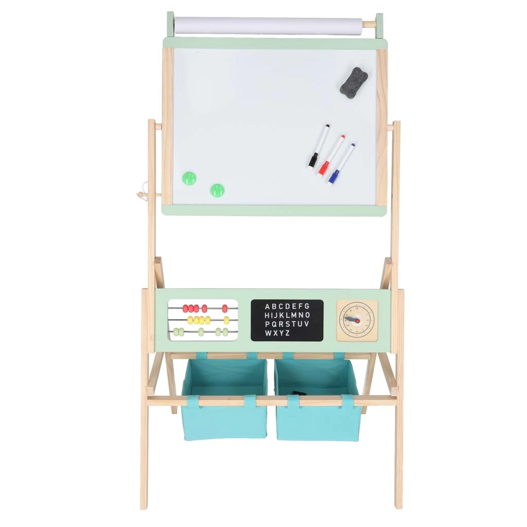 - Lavagna bifacciale 3in1 in legno con 2 cestini in tessuto, 6× gessetto, 6× pastello a cera, 2× magnete, 3× pennarello magnetico, spugna cancellabile, 41 magneti (lettere e numeri)
