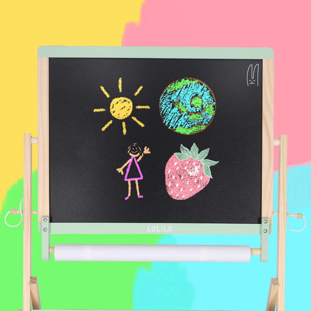 Un’unica lavagna offre una superficie nera per gesso, una superficie bianca magnetica cancellabile a secco e un supporto con rotolo di carta per disegnare e dipingere.