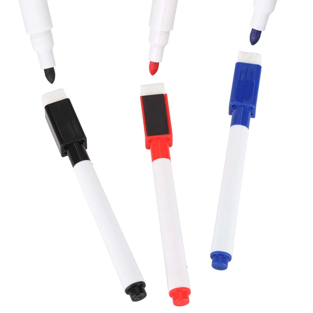 Due cestini in tessuto mantengono tutto in ordine. Nella confezione trovi gessetti, pastelli a cera, 3 pennarelli magnetici con gomma, spugna cancellabile, magneti e un set di lettere e numeri.