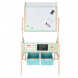 La struttura in legno è stabile e resistente, le due tasche in tessuto tengono tutto a portata di mano. Il set include anche gessetti, pastelli a cera, pennarelli magnetici, spugna cancellabile e magneti – basta aprire la scatola e creare.