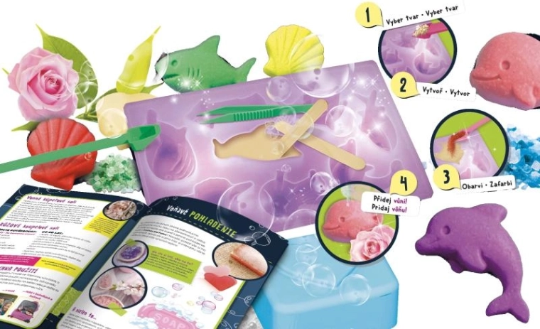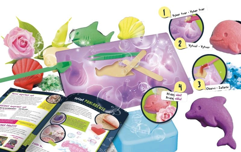 Questo set divertente ed educativo ti permette di realizzare facilmente saponi originali con motivi di creature marine. Grazie agli stampini pronti all’uso e alle scaglie di glicerina, il procedimento è semplice, sicuro e veloce. Aggiungi l’essenza colorante e la tua fragranza preferita per creare regali o una profumata decorazione per il bagno.