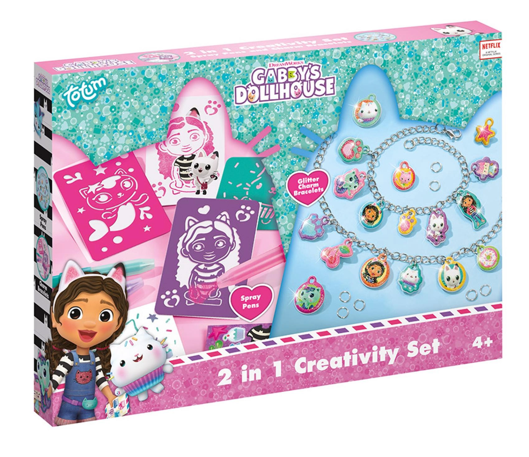 Scopri il divertente set creativo 2 in 1 con cui i bambini possono realizzare i propri disegni usando pennarelli a soffio e in più creare braccialetti con ciondoli a tema GABBY'S DOLLHOUSE. Il set sviluppa creatività, motricità fine e fantasia – un regalo ideale per piccoli creatori dai 4 anni in su.