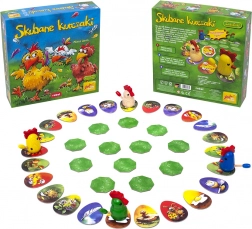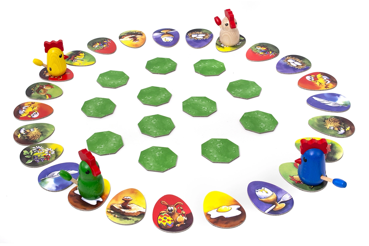 Contenuto della confezione: 24 tessere uovo, 12 tessere ottagonali del percorso, 4 pedine pulcino, 4 codine piumate, regolamento del gioco.