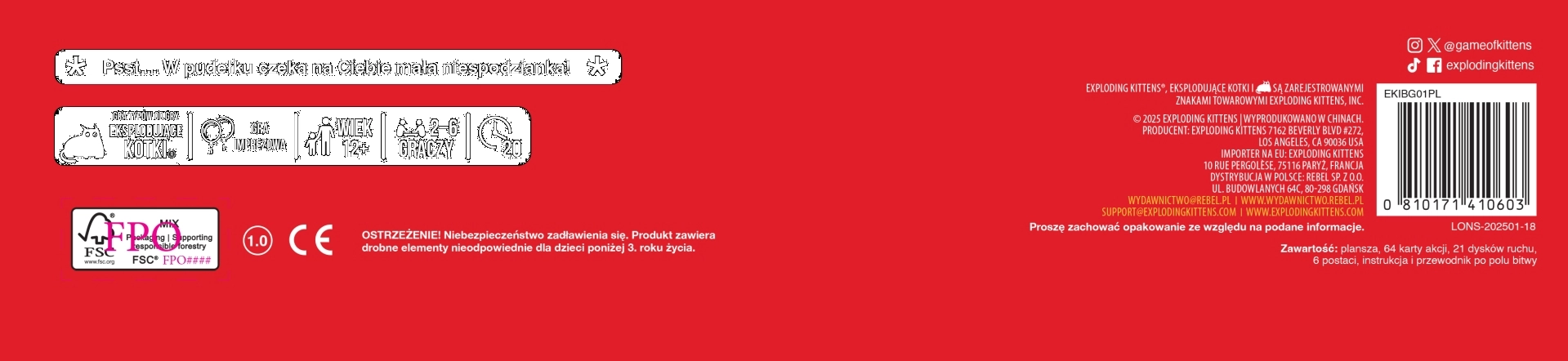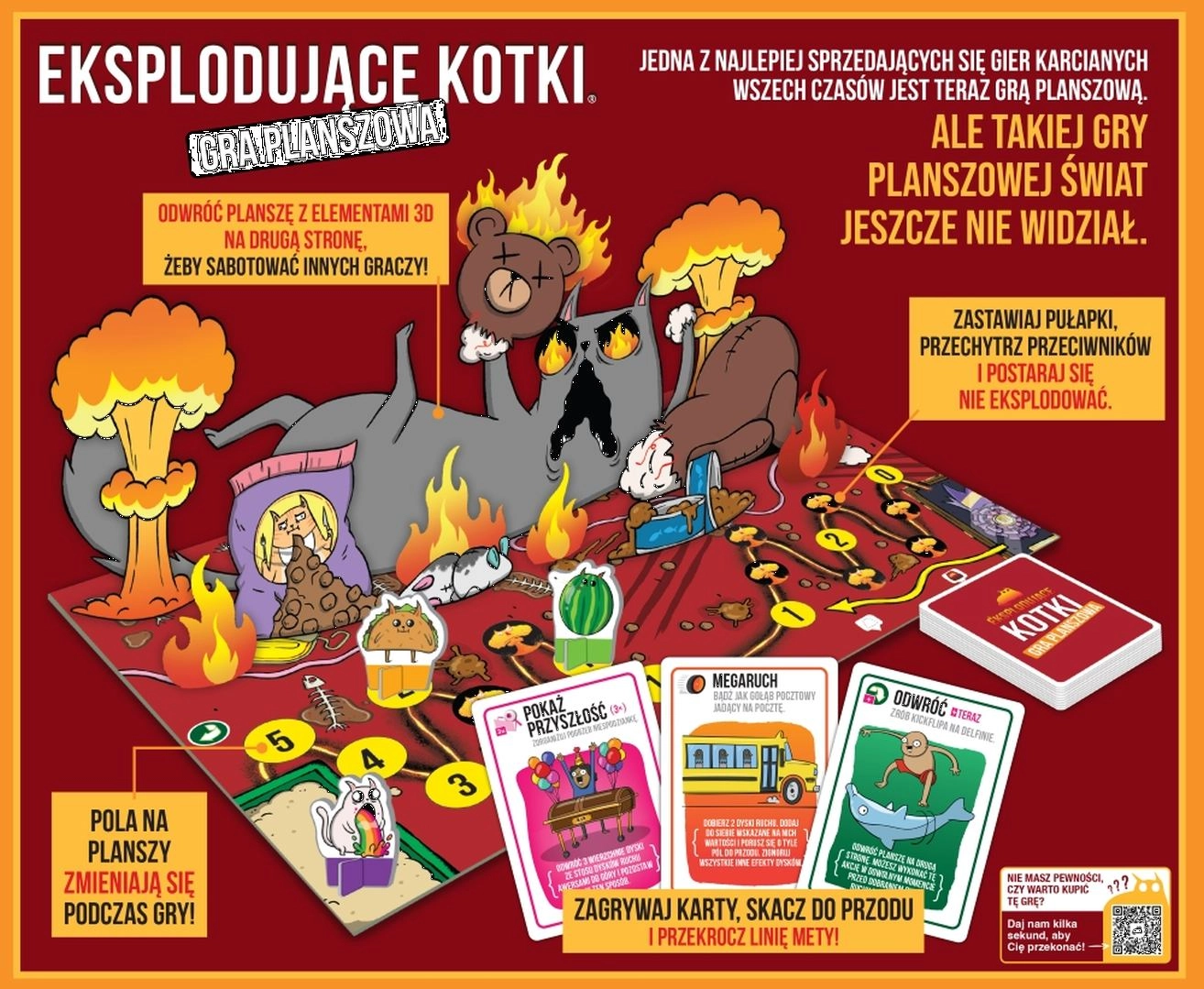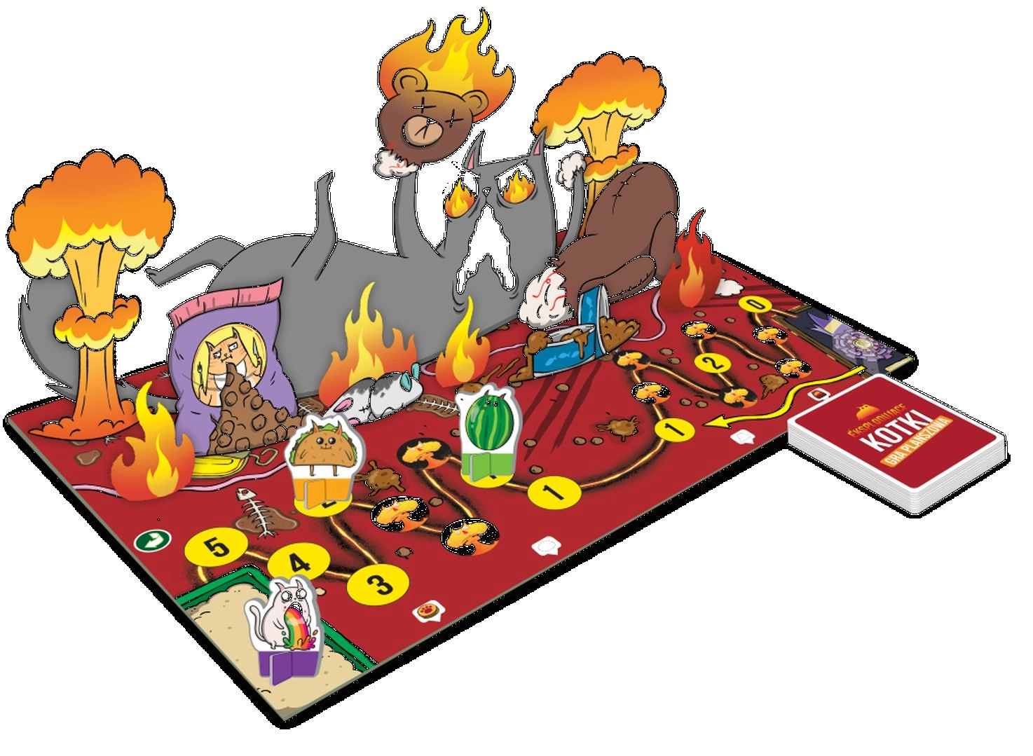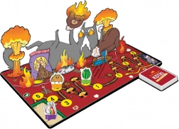 Gatti Esplosivi: gioco da tavolo trasferisce l’energia folle della popolare versione di carte su una plancia di gioco. I giocatori si alternano giocando carte azione e pescando dischi di movimento per avanzare lungo il percorso fino al traguardo. Lungo la strada li attendono trappole e sabotaggi degli avversari, da superare solo con un uso intelligente delle carte di disinnesco.