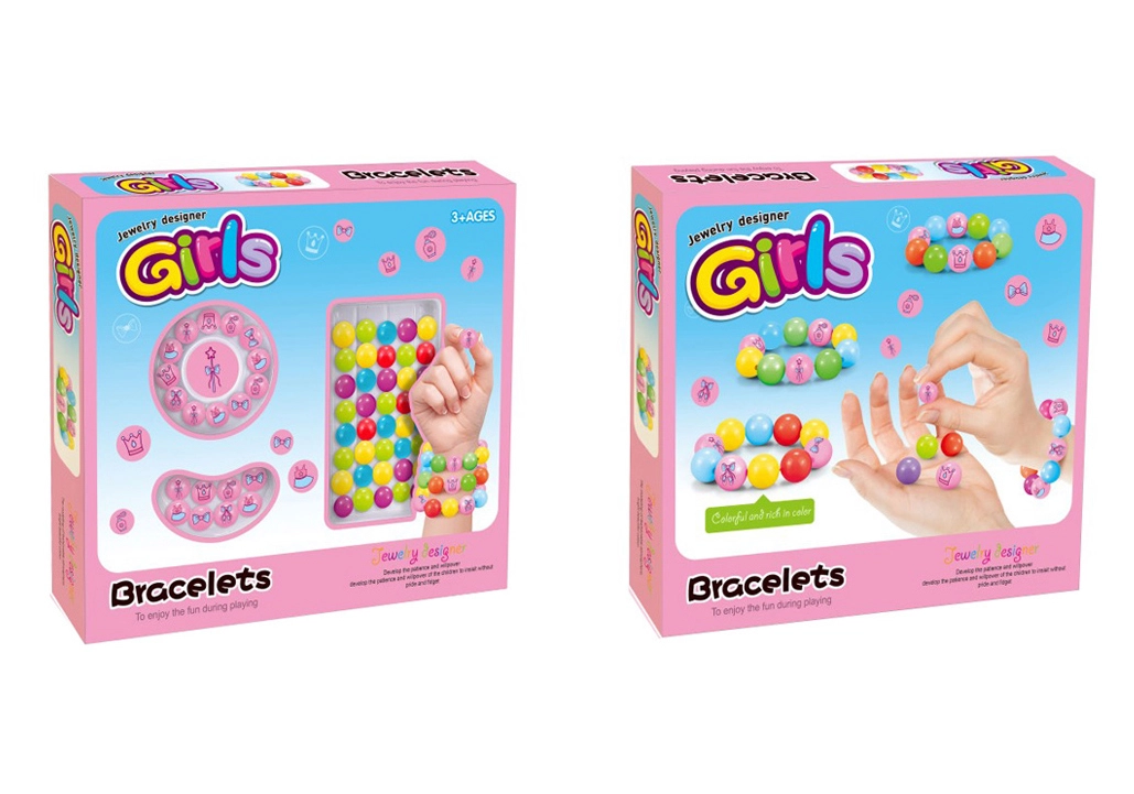 Divertente set per piccoli creatori con cui realizzare braccialetti originali con perline colorate. Contiene un mix di perline di vari colori e perline rosa con immagini per decorare gioielli unici.