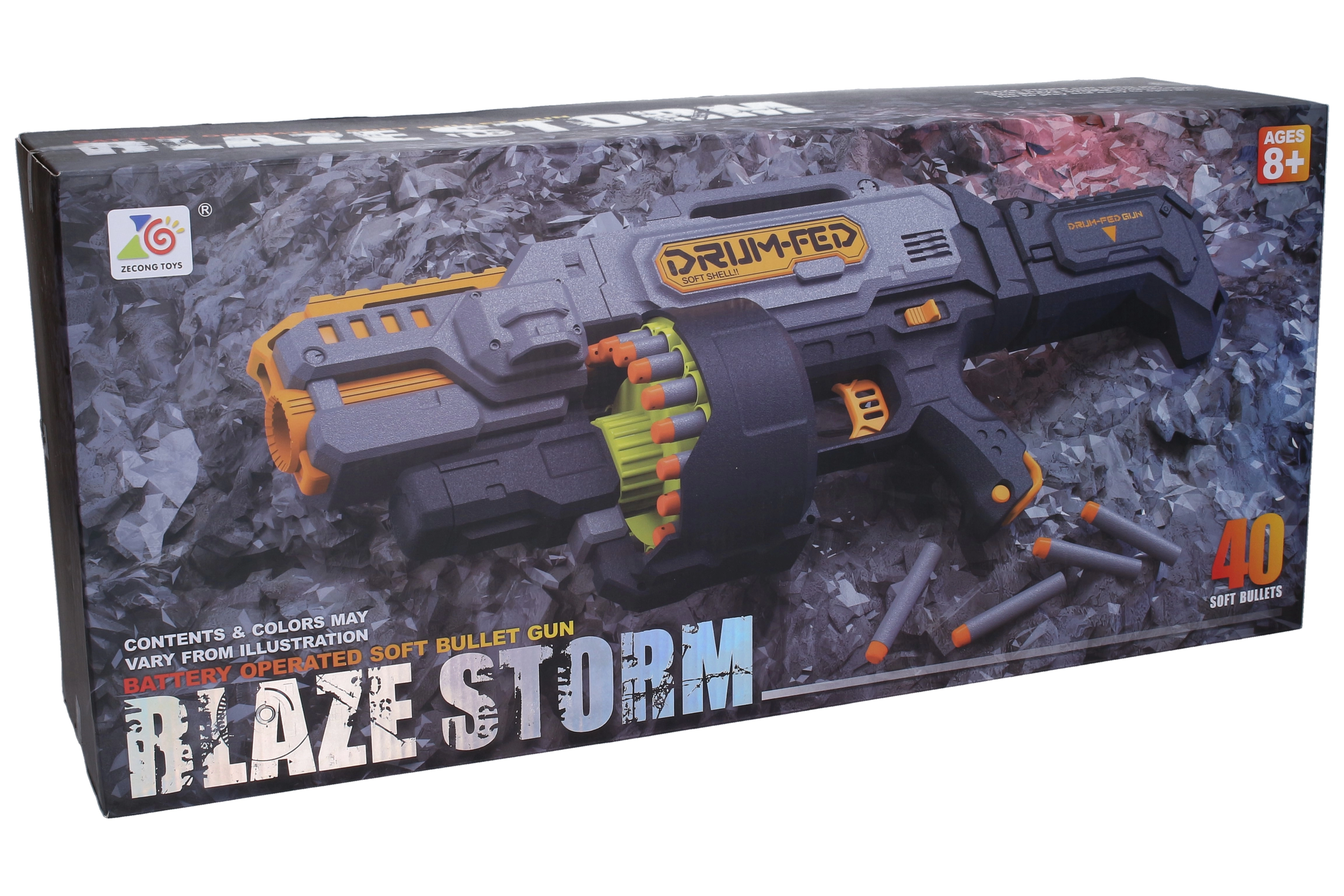 Potente mitragliatrice per bambini a proiettili in gommapiuma con caricatore a tamburo per un divertimento assicurato in casa e all’aperto. Inclusi 40 proiettili morbidi (standard e con ventosa), batteria ricaricabile 3,7 V 500 mAh e cavo USB. Grazie all’interruttore ON/OFF è facile da usare e le dimensioni 56 × 22,5 × 13,3 cm garantiscono una presa comoda.