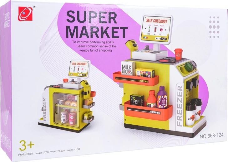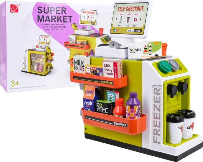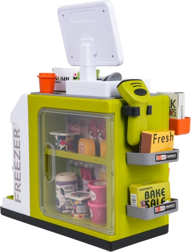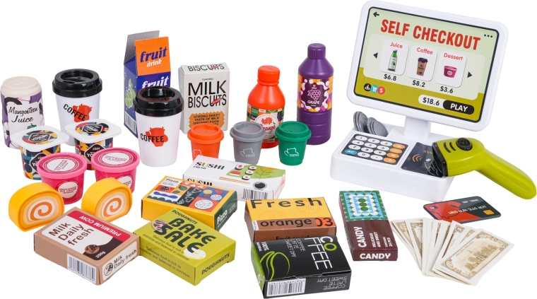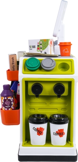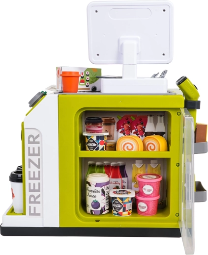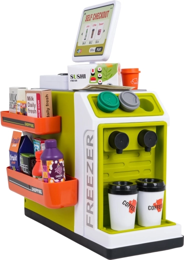 Il set è realizzato in plastica di qualità e resistente, con colori vivaci. Non mancano la macchina da caffè con capsule e bicchierini, numerose confezioni con “alimenti” e pratici scomparti per un’organizzazione ordinata. Lo scanner offre effetti luminosi e sonori, la cassa emette suoni alla pressione dei tasti e durante il pagamento con carta.