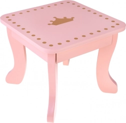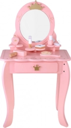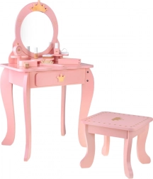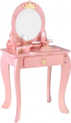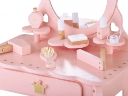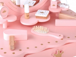 Il set comprende anche un comodo sgabello e numerosi accessori in legno e plastica: spazzola, phon, piastra per capelli, elastici, rossetto, ombretti, profumo, smalto per unghie e tre bicchierini a cuore per riporre i piccoli oggetti. La delicata combinazione di rosa, oro e dettagli argentati si abbina perfettamente alla cameretta dei bambini.