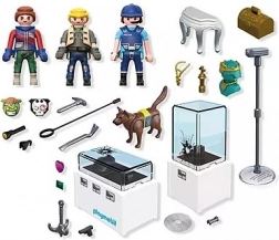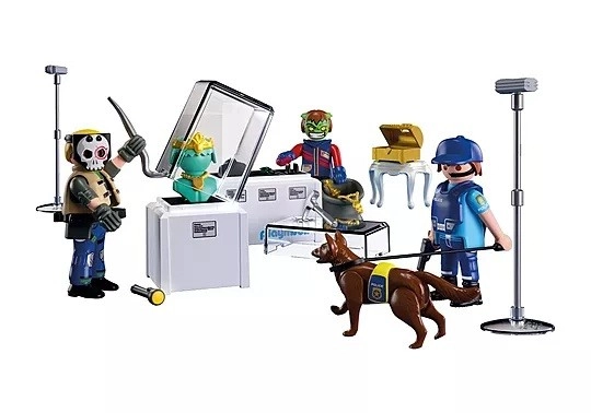 Allarme al museo: i ladri cercano di scassinare le vetrine e fuggire con il bottino! Il poliziotto si muove silenzioso tra le sale espositive e, insieme al cane da servizio, dà il via all’inseguimento. Il set PLAYMOBIL Action Heroes offre una storia dinamica con tanti accessori realistici e funzioni che catapultano i bambini nel mondo dei grandi colpi.