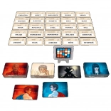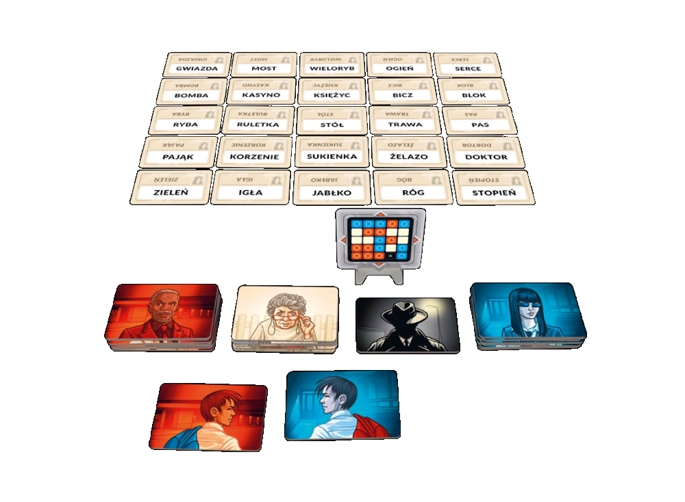 - 16 carte Agente in 2 colori; 1 carta Agente doppio; 7 carte Passante innocente; 1 carta Assassino; 40 carte Chiave; 200 carte con 400 nomi in codice; regolamento; supporto