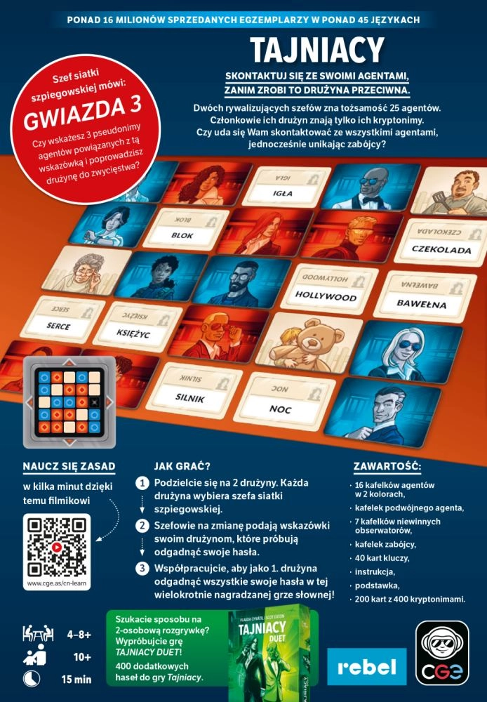 Scoprite il fenomeno dell’intrattenimento da tavolo Tajniaci – un intelligente gioco di parole a squadre in cui, tramite indizi di una sola parola, collegate parole in codice evitando il pericoloso assassino. Il gioco offre partite rapide di circa 15 minuti, alta rigiocabilità grazie a 400 nomi in codice e intensa collaborazione di squadra, mettendo alla prova la creatività e il pensiero associativo di tutto il gruppo.