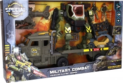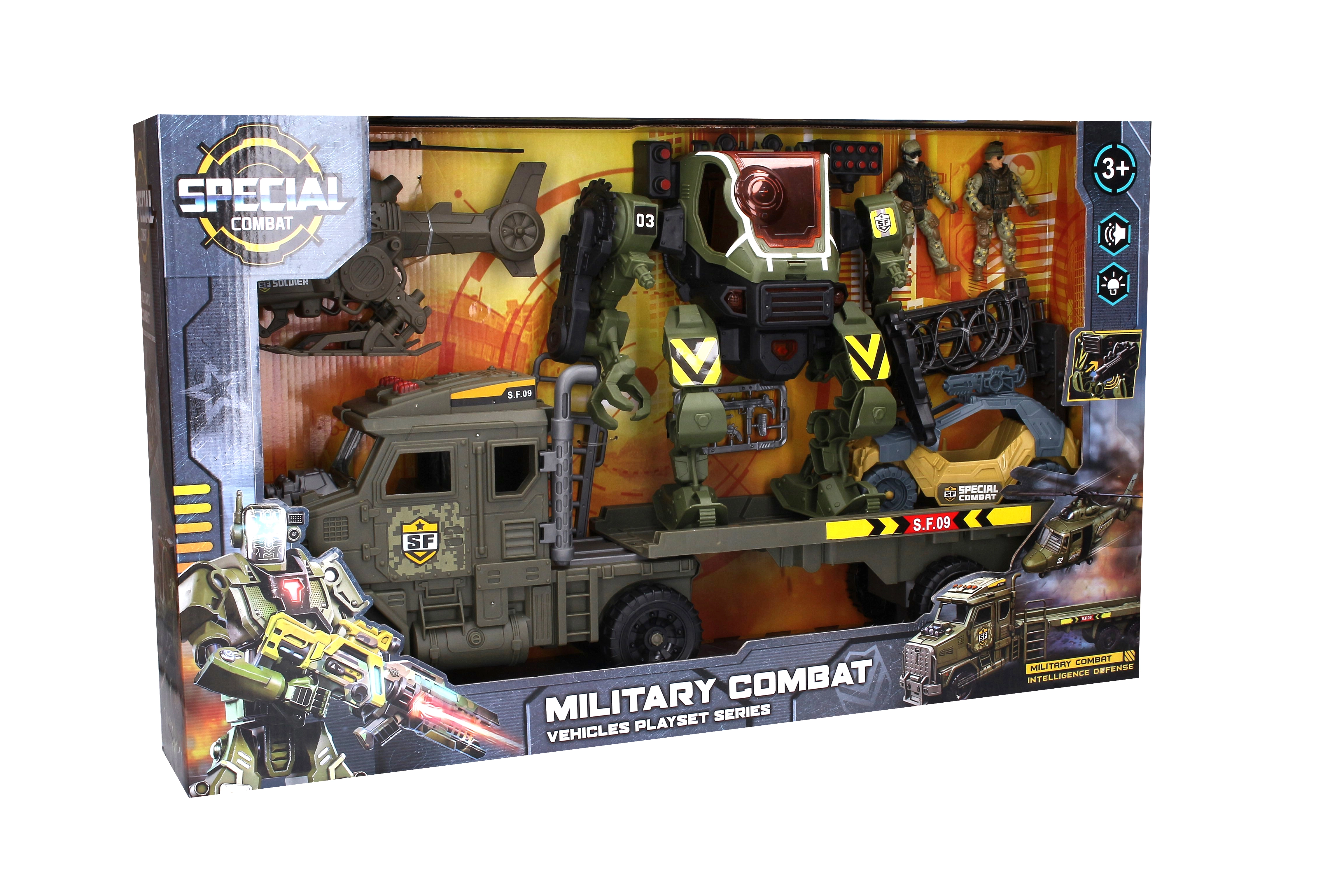 - Trattore militare, robot mecha con effetti, elicottero, buggy con mitragliatrice, 2x figurina di pilota, fortificazioni e dotazioni per i soldati