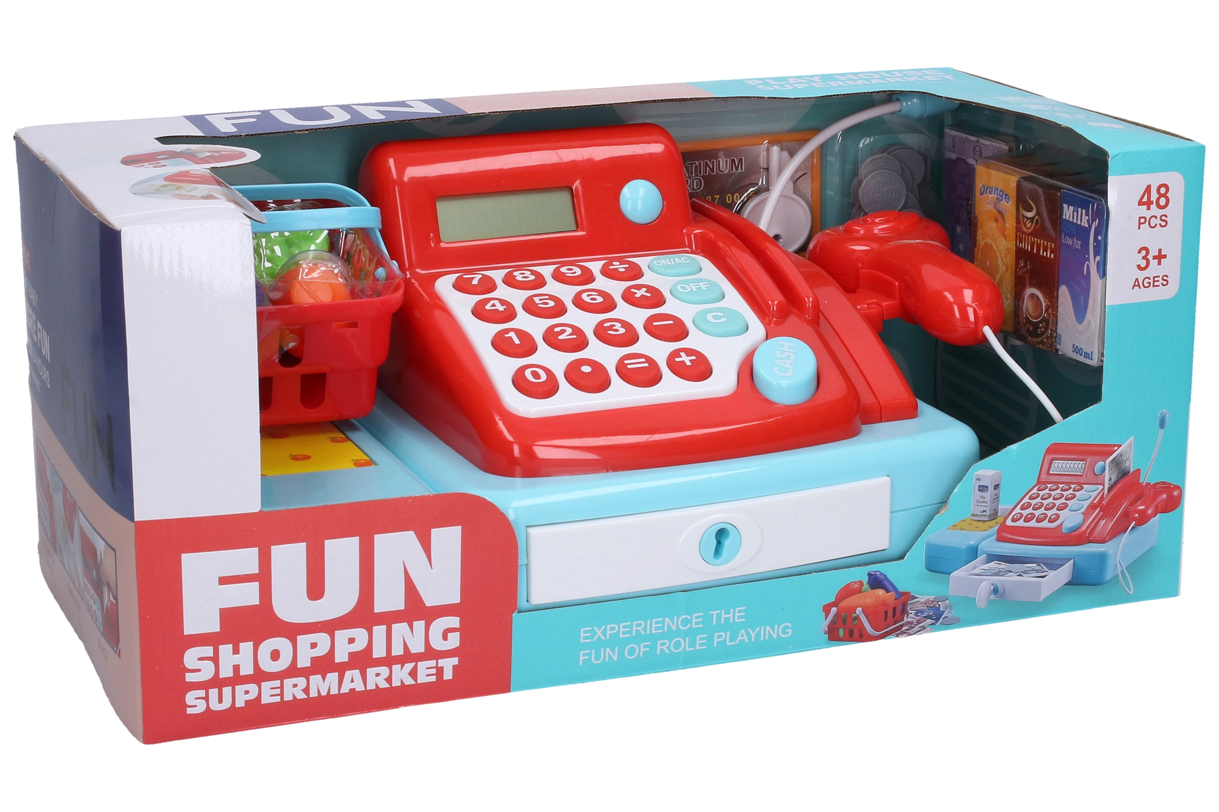 Divertente cassa giocattolo con accessori per un gioco di negozio realistico. Offre effetti luminosi e sonori, un cestino con alimenti e soldi di carta. Le dimensioni compatte 33 × 19 × 14 cm sono ideali per i piccoli negozianti. Funziona con 2× batterie AA (non incluse).