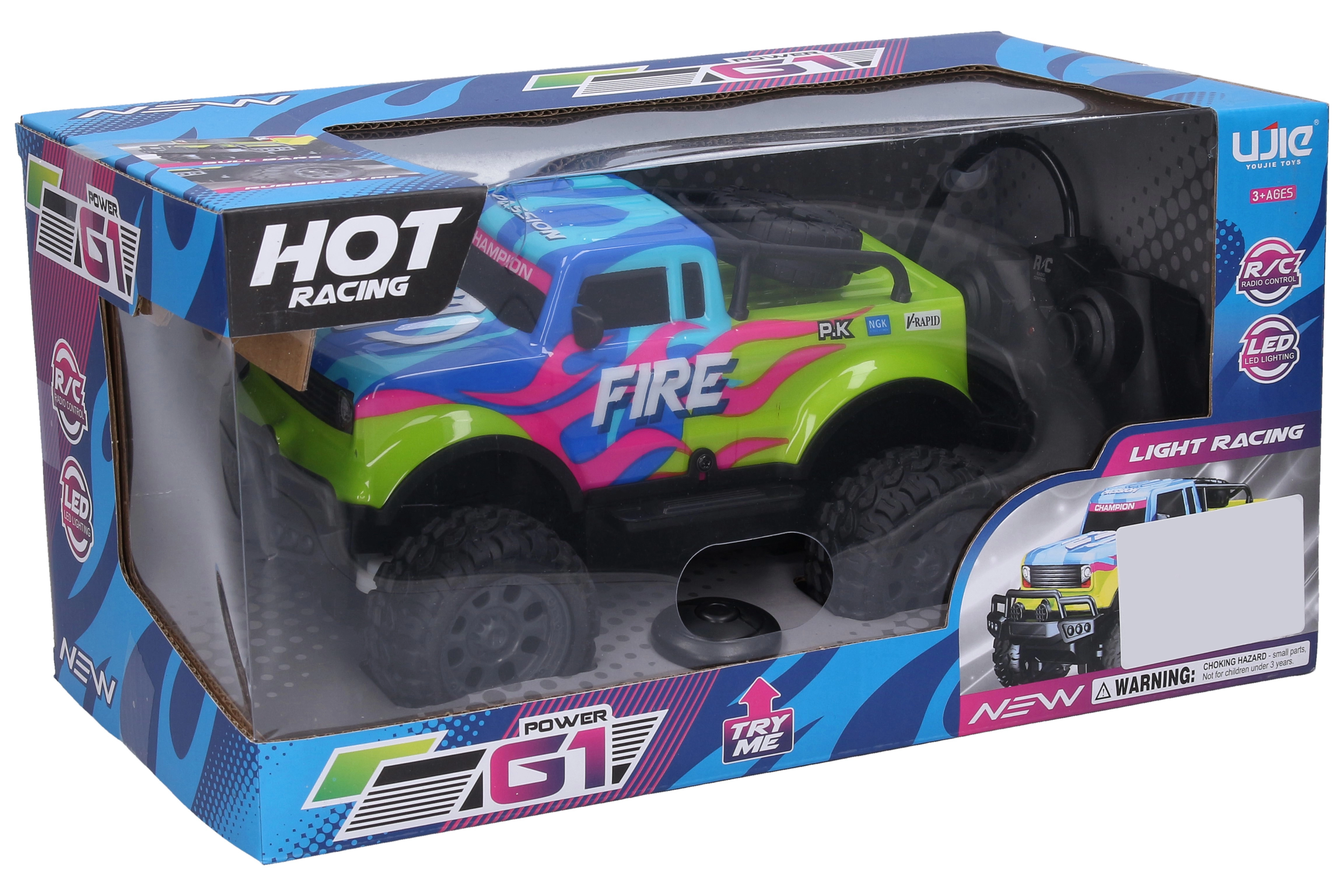 L’auto RC luminosa Fire porta grande divertimento per bambini e adulti. Grazie ai elementi luminosi sulla carrozzeria spicca durante la guida sia di giorno sia al crepuscolo. Si controlla facilmente con il telecomando a 27 MHz e raggiunge una velocità fino a 10 km/h.