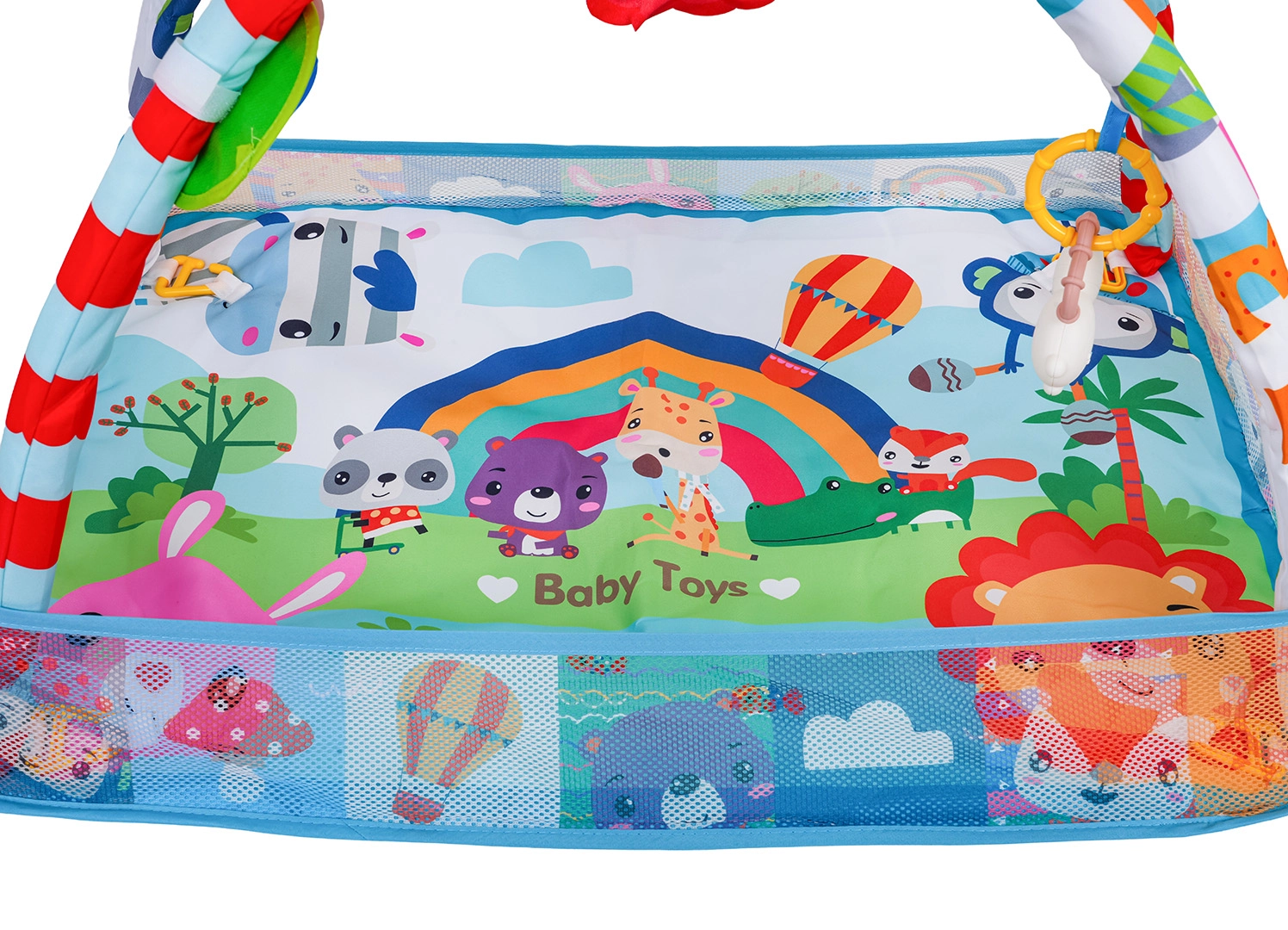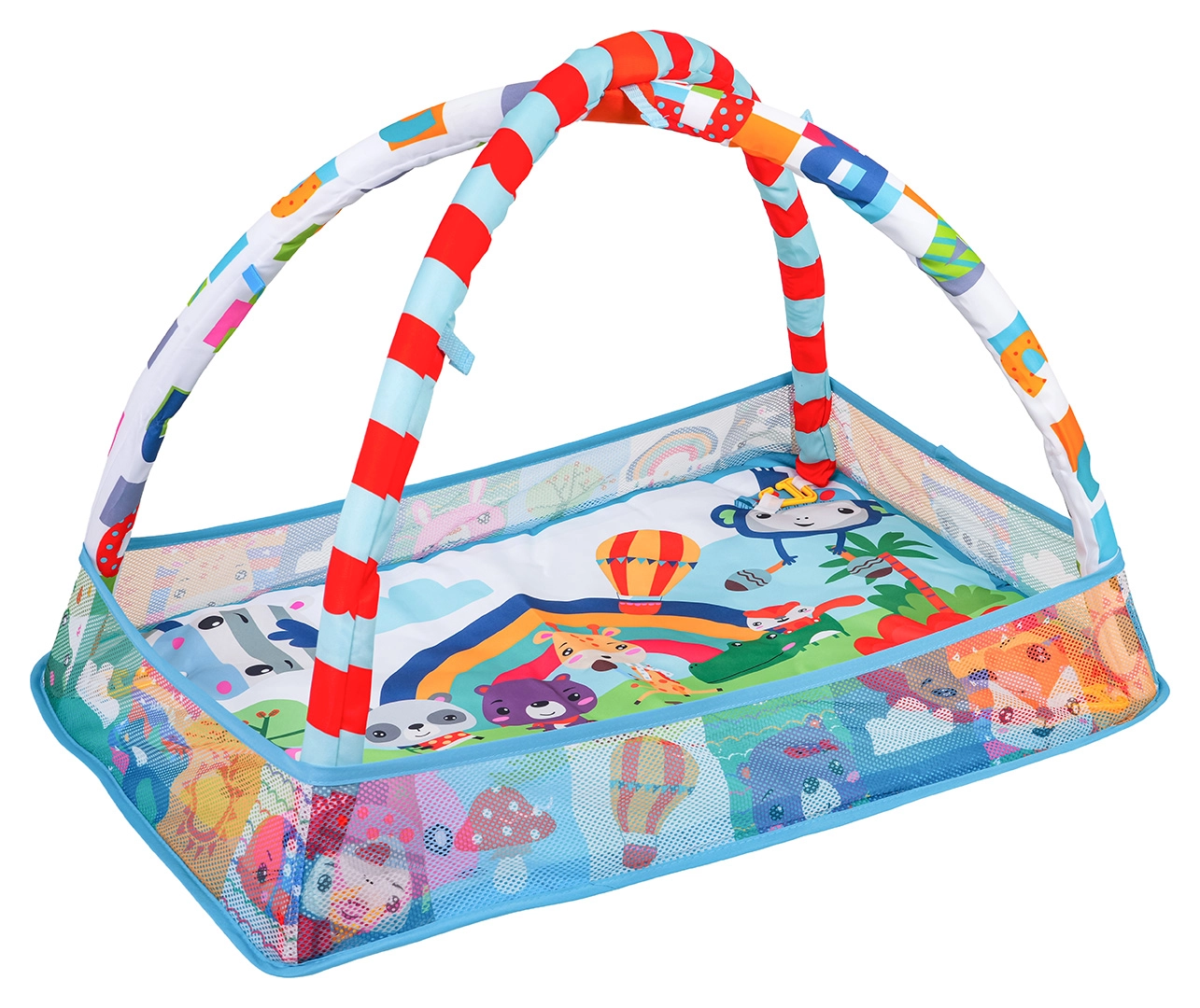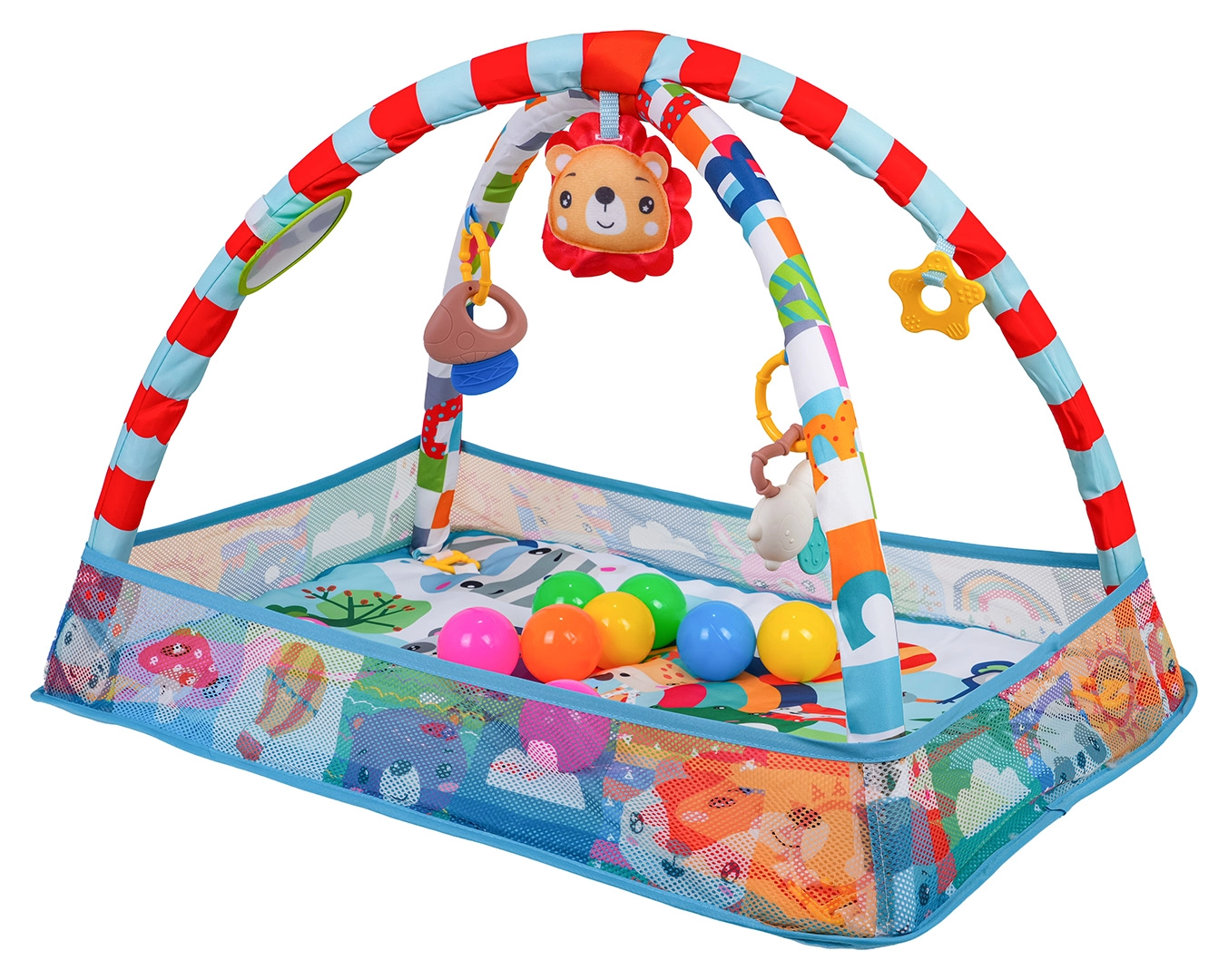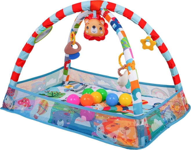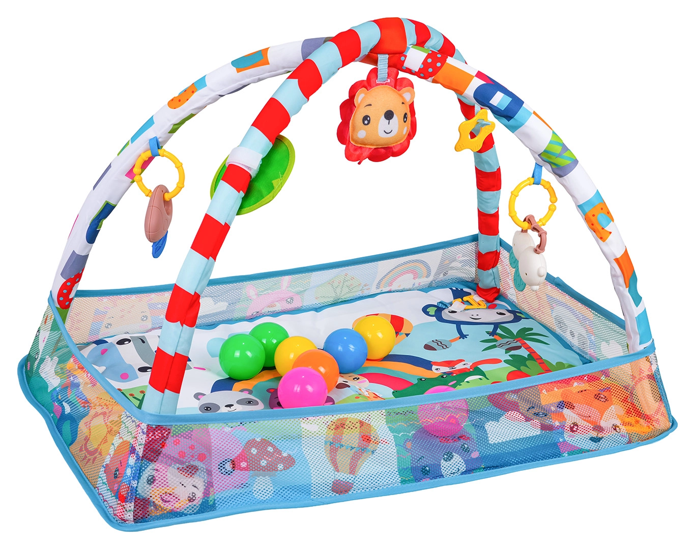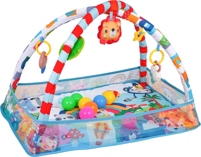 Questo colorato tappetino da gioco crea un ambiente sicuro e stimolante per lo sviluppo sensoriale e motorio fin dai primi giorni. Grazie ai lati in rete, mantiene giocattoli e palline al loro posto e offre al piccolo uno spazio tranquillo sia per stare sdraiato sulla schiena sia per il tummy time.