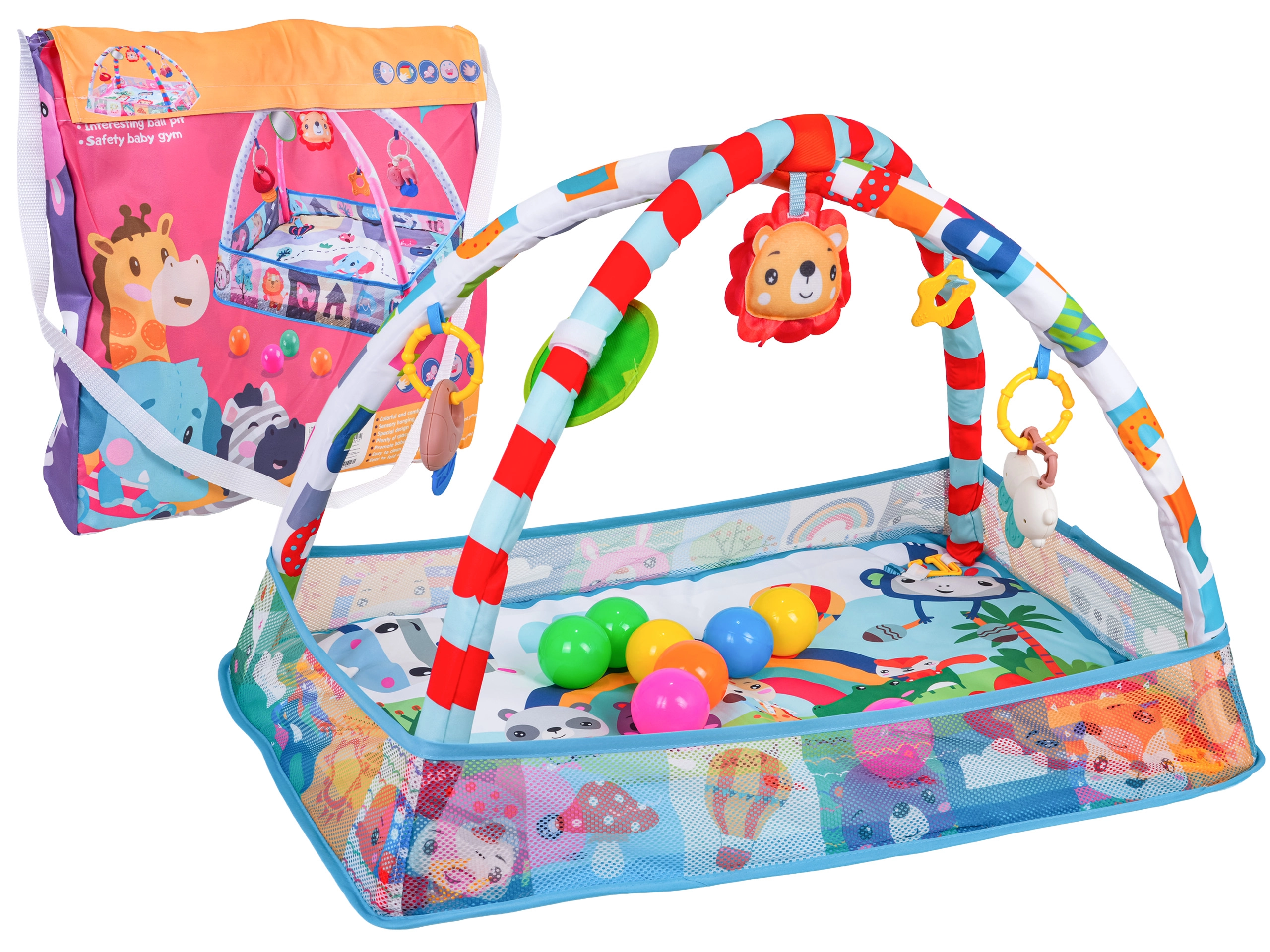 Contenuto della confezione: tappetino con giocattoli sospesi, 8× palline di plastica per la piscina asciutta e borsa colorata a tracolla per un facile trasporto e stoccaggio.