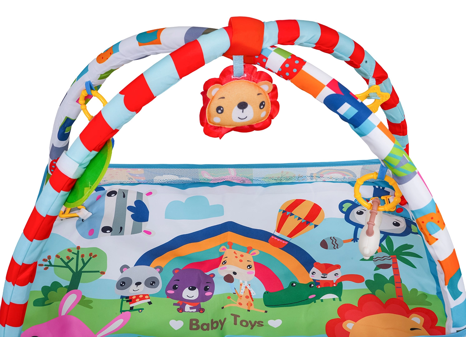 L’arco removibile con giocattoli sospesi (specchietto sicuro, giochi con sonagli e massaggiagengive, leoncino in peluche con squeak, ecc.) incoraggia il bambino ad allungarsi, afferrare e scoprire. Il tappetino è realizzato con materiali sicuri e facilmente lavabili, ha colori vivaci e una struttura stabile per il gioco quotidiano.