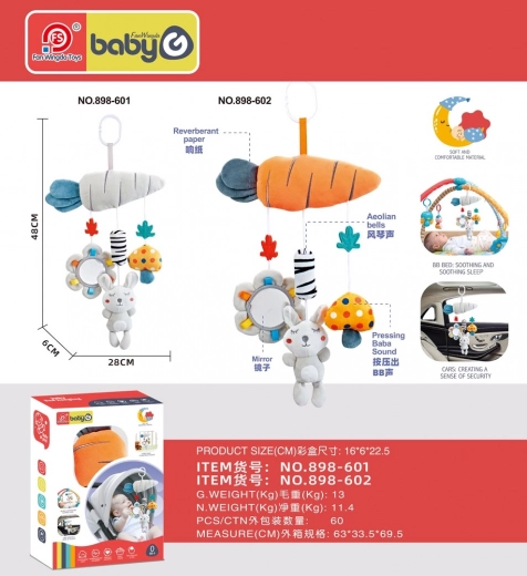 Gioco sensoriale sospeso per passeggino, lettino o seggiolino auto, adatto fin dai primi giorni di vita. Realizzato con materiali morbidi e sicuri, offre elementi fruscianti e squeak, campanelli a vento e specchietto sicuro. I colori vivaci favoriscono la concentrazione, la presa e lo sviluppo dei sensi del bambino.