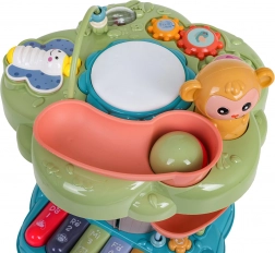 effetti luminosi e sonori, pianofortino 4 modalità, tamburo, melodie, nomi dei numeri e degli animali, ingranaggi, perline, sonaglio, abbinamento delle forme, scivolo a spirale per palline