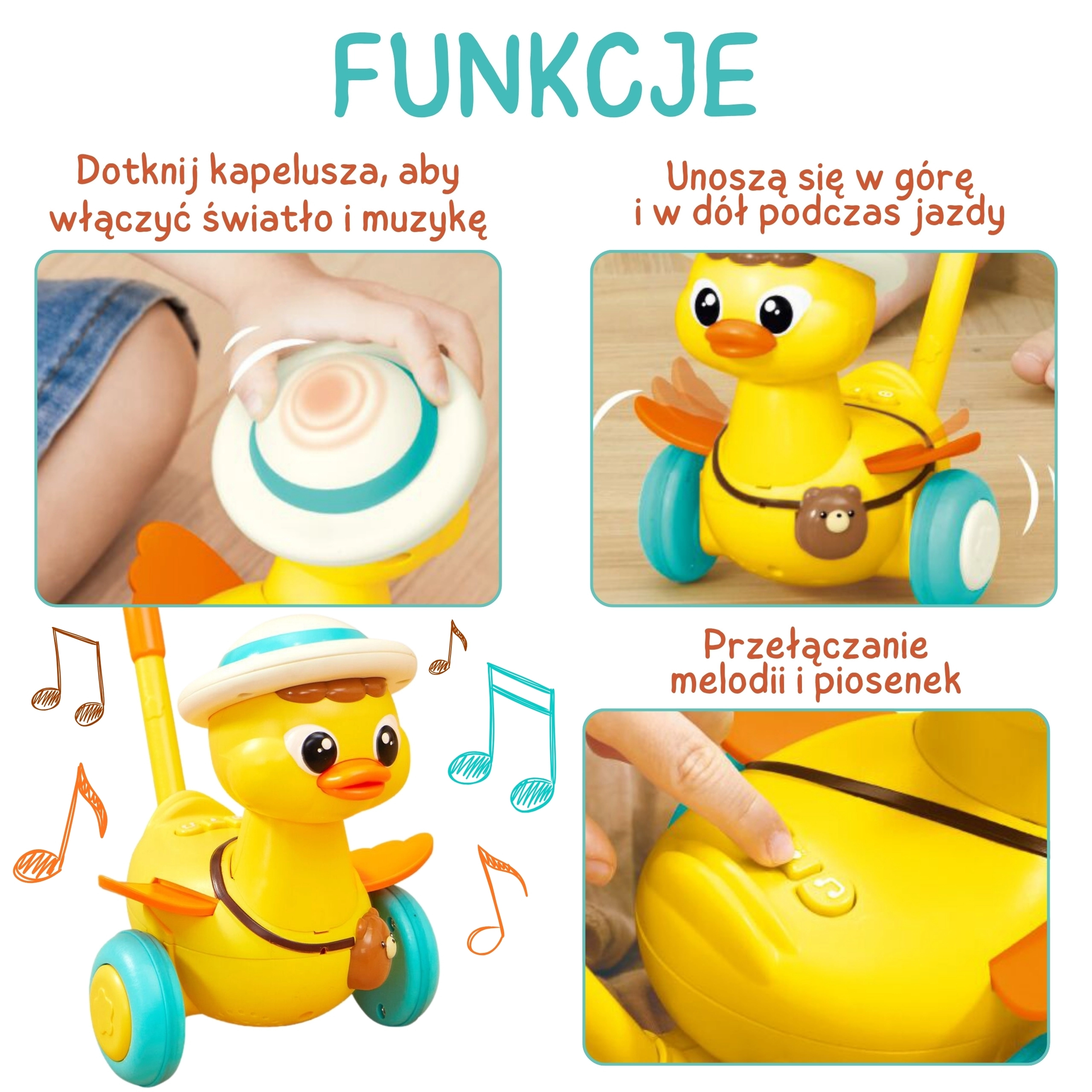 - Movimento di gioco: le ruote saltellanti mettono in moto l’anatroccola mentre si cammina
