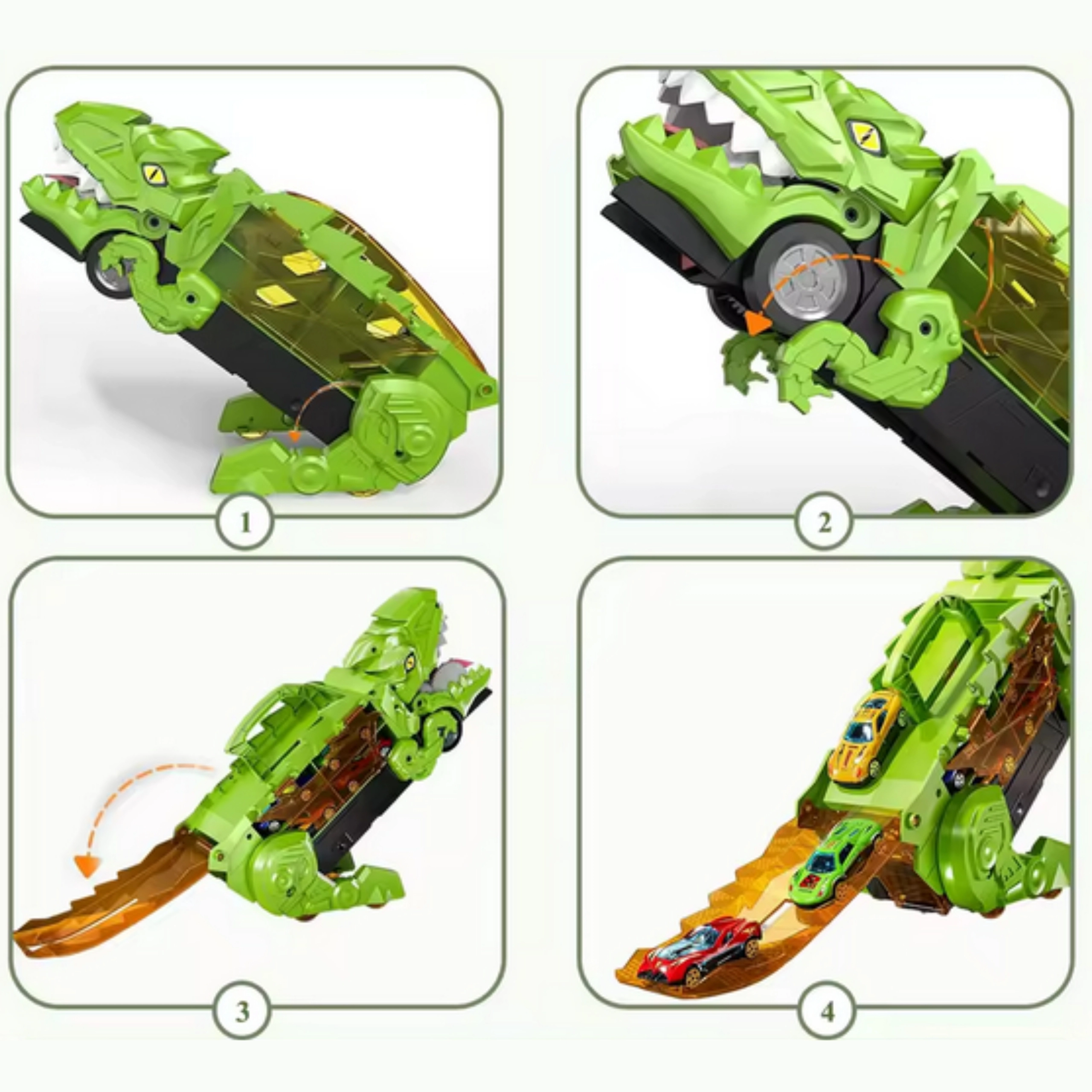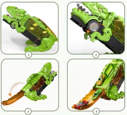 Apri la testa del dinosauro e sgancia lo scivolo arancione. Le macchinine scivolano fluide all'esterno e la gara può iniziare.