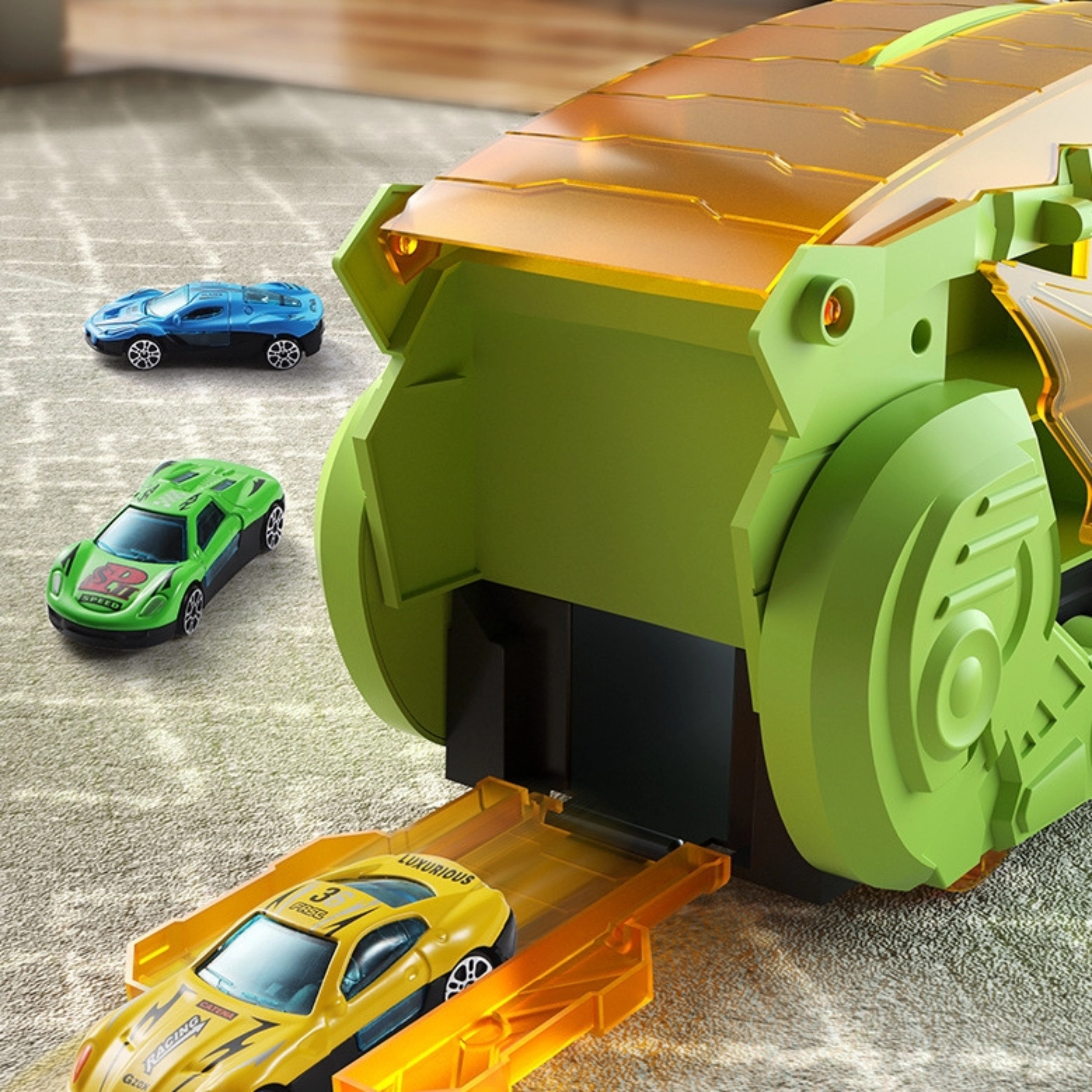 Il camion trasportatore dei dinosauri si trasforma in un attimo in un campo d’azione: apri la rampa arancione, carica le macchinine e falle partire dalla bocca del dinosauro aperta. Grazie alla maniglia pratica e agli scomparti interni, riponi facilmente tutte le auto e portale con te ovunque. Colori vivaci e dettagli marcati stimolano la fantasia e invitano al gioco.