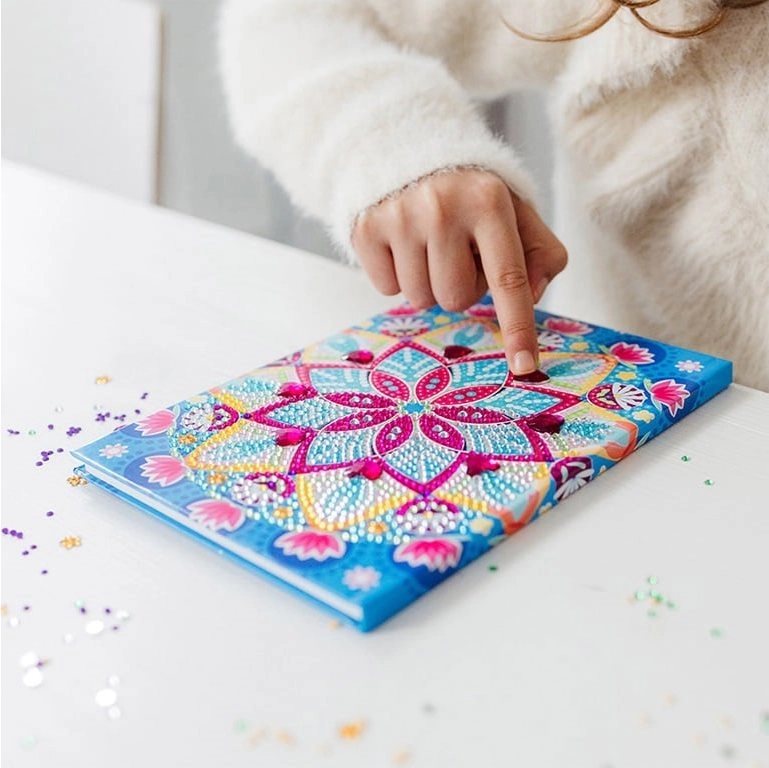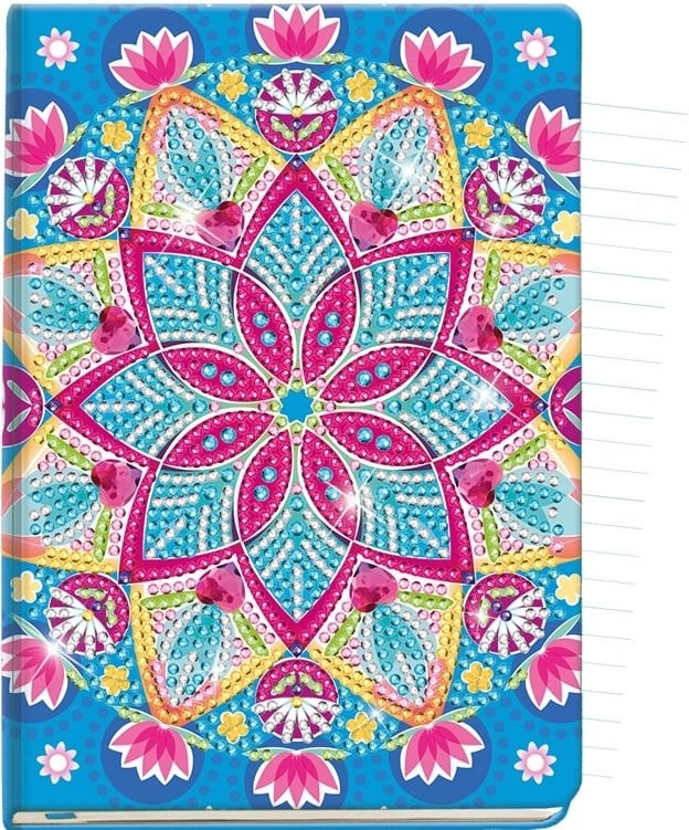 Trasforma il tuo diario in un gioiello unico. Questo quaderno A5 a righe con motivo di mandala di loto si completa con la tecnica della pittura diamantata. I punti adesivi sulla copertina si riempiono facilmente con le pietrine per creare un design brillante, resistente ed elegante che ti farà piacere a ogni apertura.