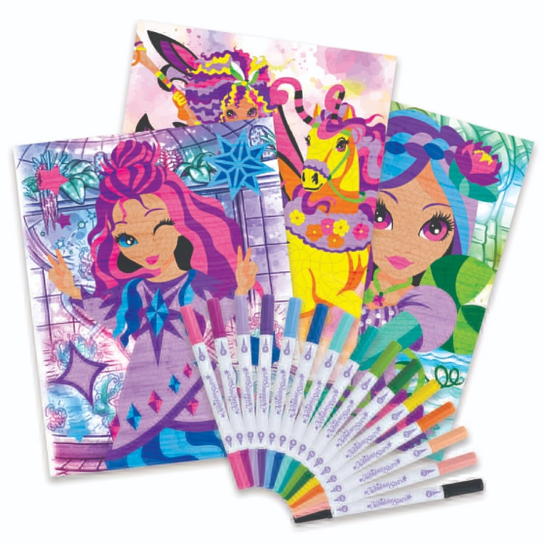 Tutto è riposto in una custodia magnetica rigida che protegge pagine e pennarelli. I pennarelli a doppia punta offrono un’ampia gamma di tonalità per colorare con precisione sia i dettagli sia le superfici. Il set è anche un ottimo regalo per tutti gli amanti del disegno e dei motivi fantastici.