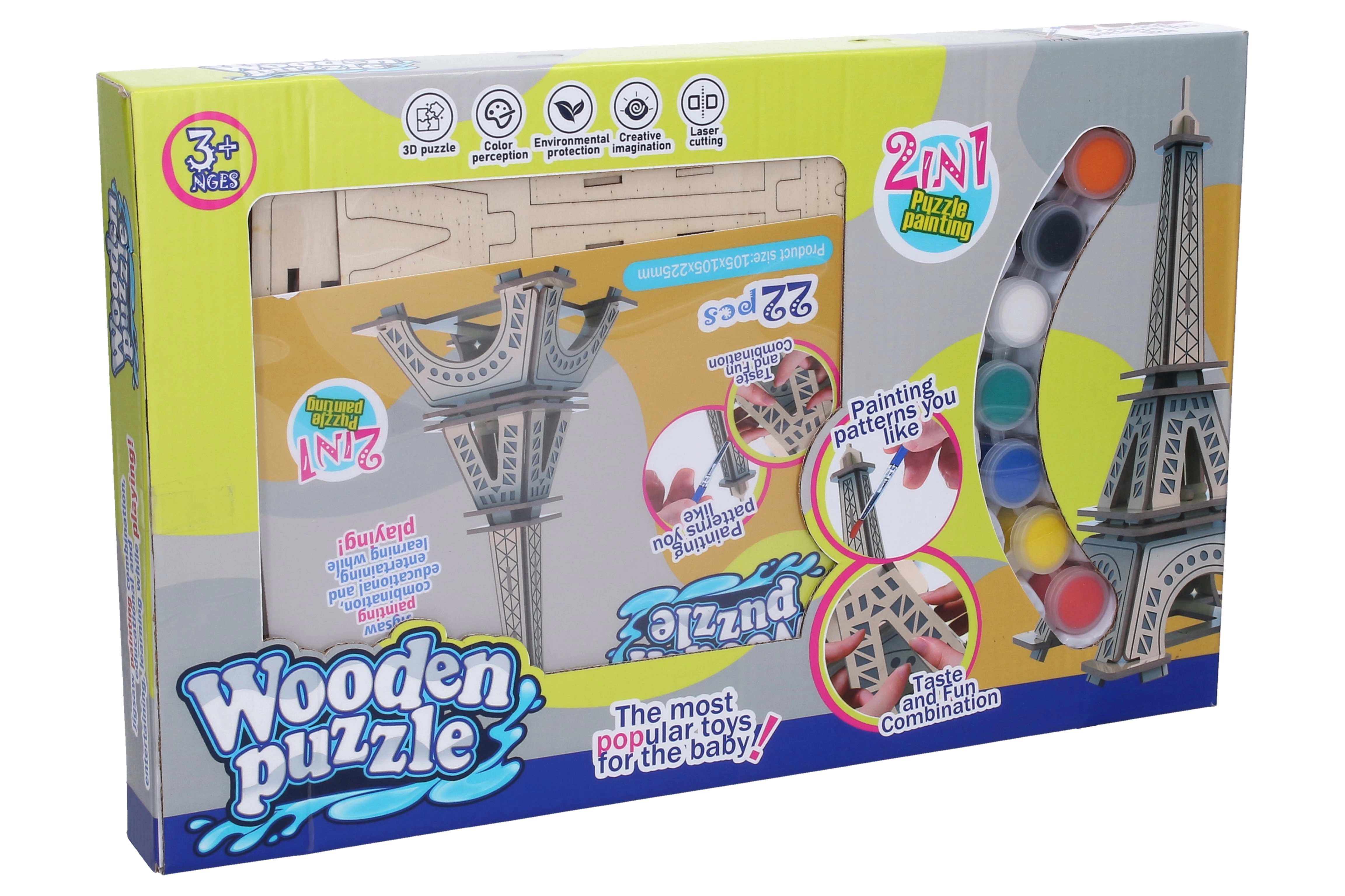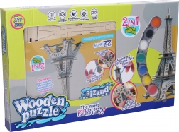 Costruisci la tua miniatura del famoso monumento: Puzzle 3D in legno TORRE EIFFEL con set di colori e pennello. Facile da assemblare, pittura creativa e divertimento per bambini e adulti. Dimensioni dopo il montaggio: 10,5 × 10,5 × 22,5 cm.