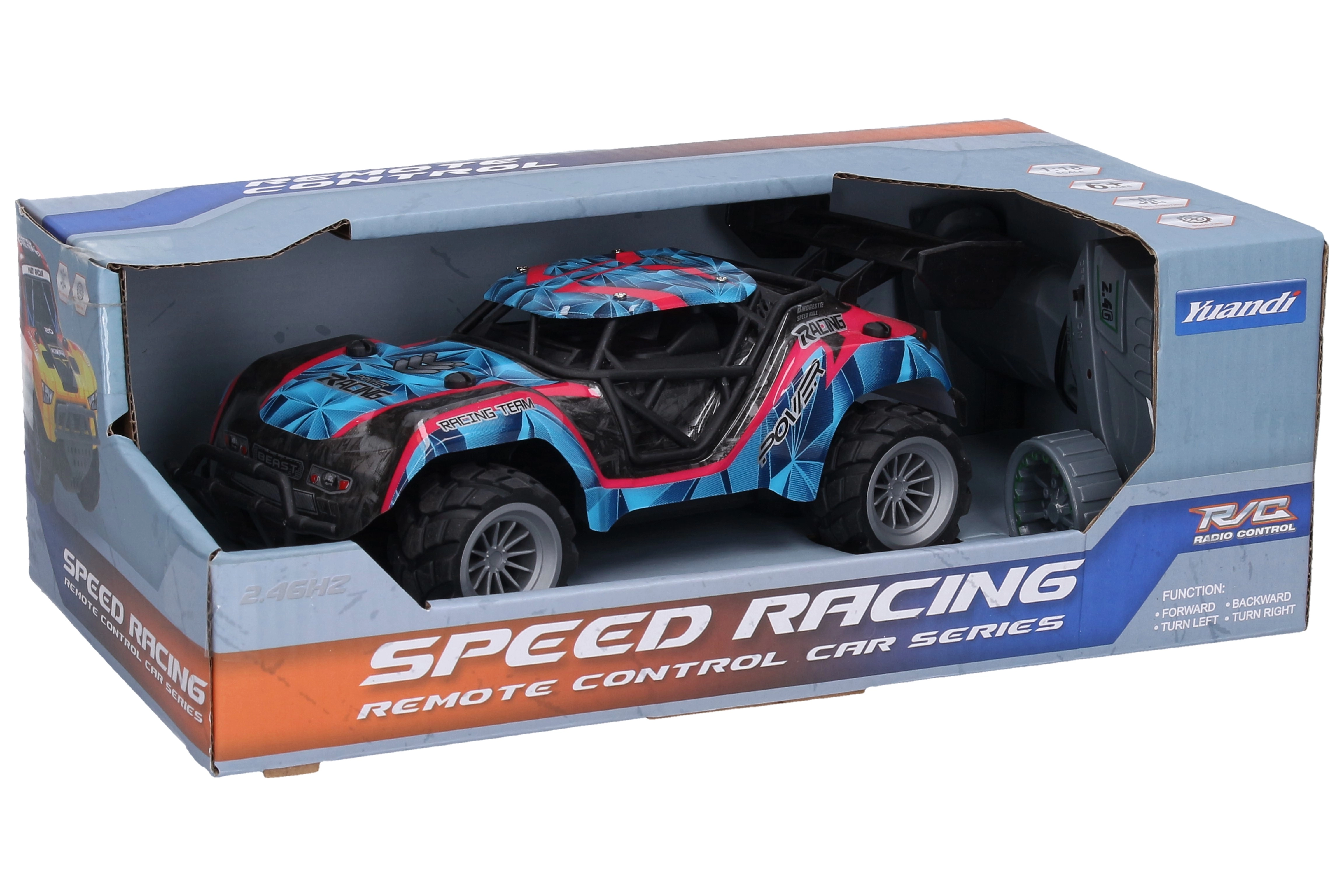 Questa buggy RC compatta è un’ottima scelta per principianti e piccoli piloti. La trasmissione stabile a 2,4 GHz permette la guida simultanea di più modelli, mentre il radiocomando a pistola offre un controllo intuitivo e preciso. Il pratico interruttore ON/OFF è posizionato sul fondo della buggy e sul radiocomando.
