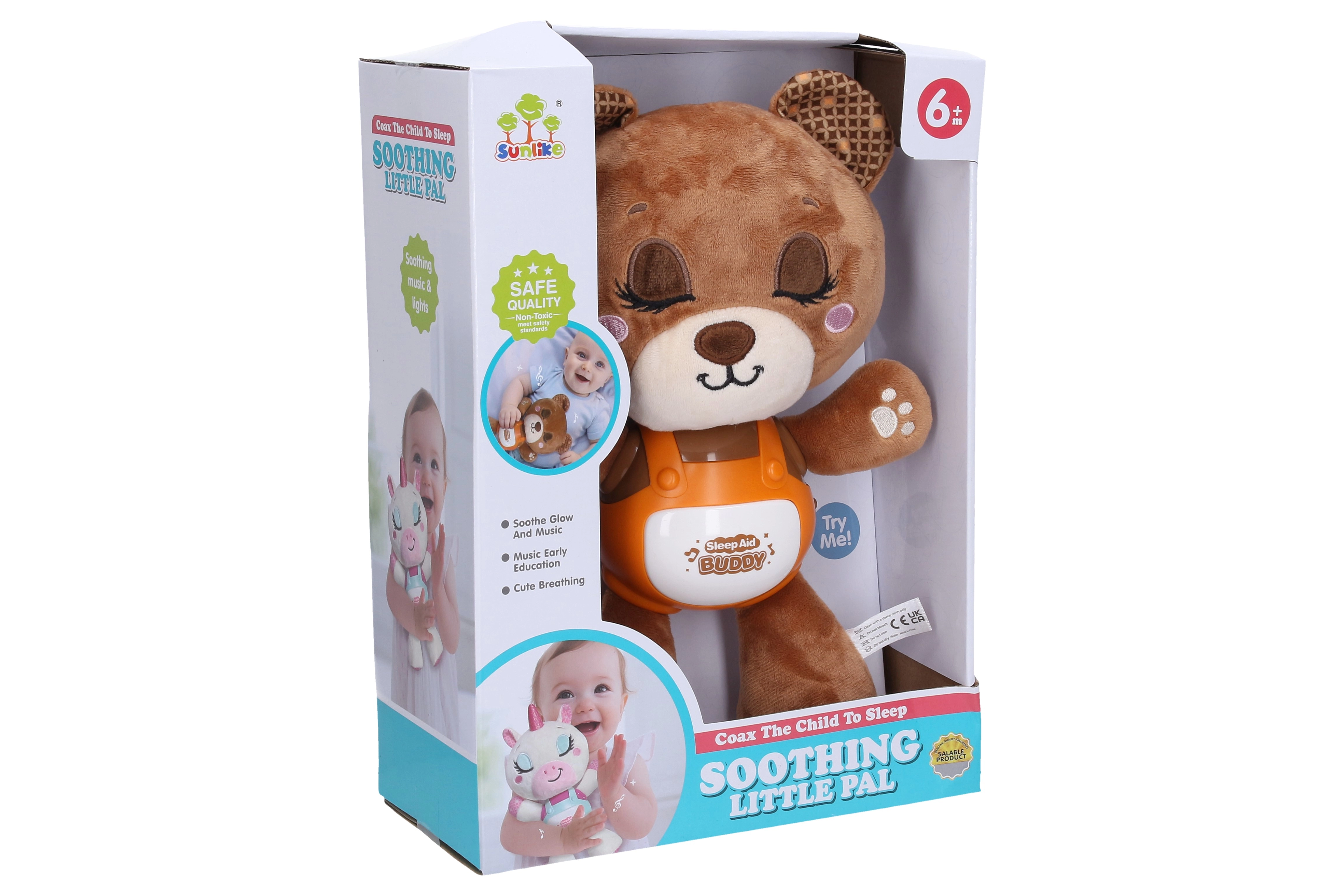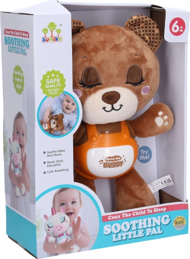 Dolce orsetto della nanna da 29 cm che aiuta i bambini ad addormentarsi serenamente grazie a una combinazione di ninnananne, musica rilassante, suono del russare e una delicata luce notturna. Il controllo è semplice: basta premere il pancino per passare tra le modalità. Comodo interruttore on/off posizionato sul lato.