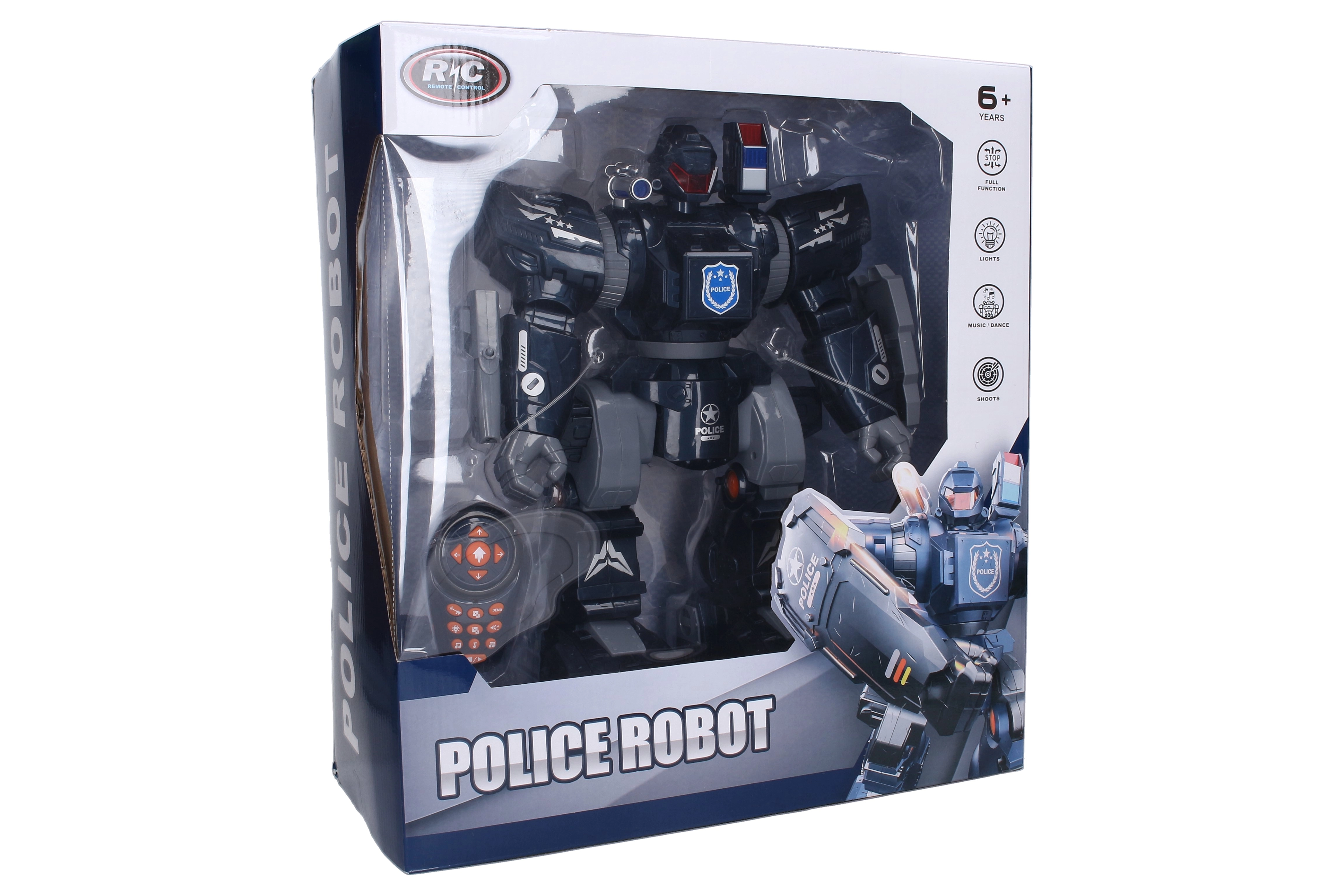 Divertente e dinamico robot della polizia RC alto 38 cm che offre tante funzioni per piccoli e grandi appassionati di tecnologia. Dispone di effetti luminosi e sonori, tiro manuale con dardi, programmazione dei movimenti, modalità danza e demo e controllo in tutte le direzioni. Grazie al telecomando a infrarossi e alla possibilità di regolare il volume, è il giocattolo ideale per un gioco creativo.