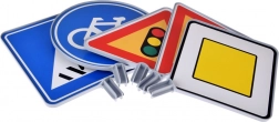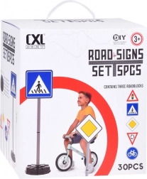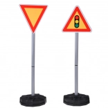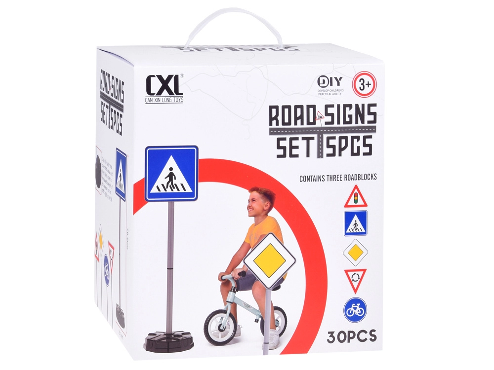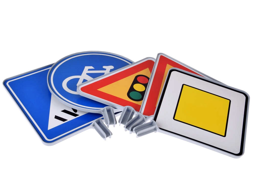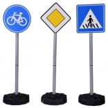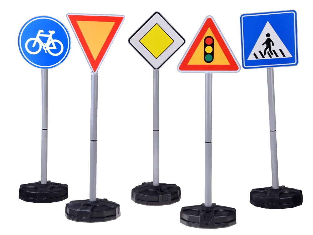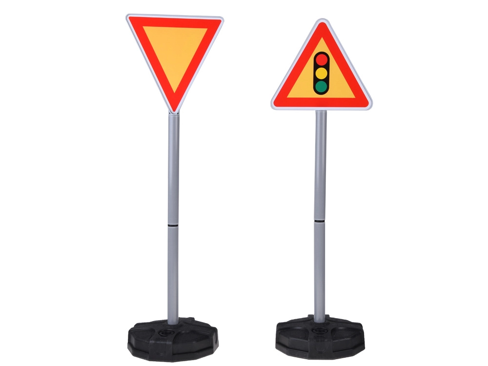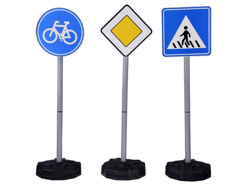 Ogni segnale è composto da base, aste e giunti che si montano in modo rapido e semplice. Le basi possono essere riempite con acqua o sabbia per la massima stabilità. La plastica leggera ma resistente è sicura per i bambini e gli adesivi colorati sono ben leggibili.