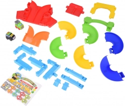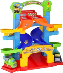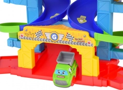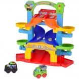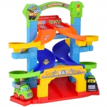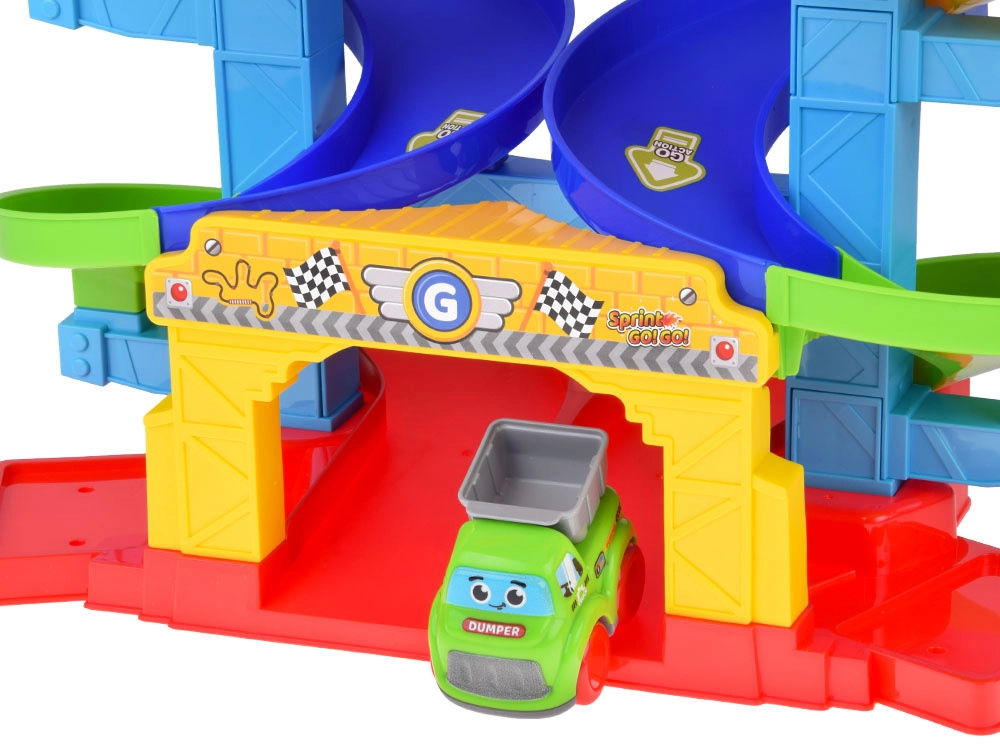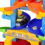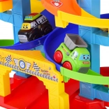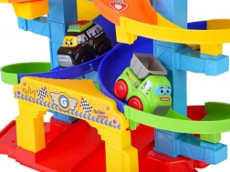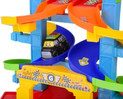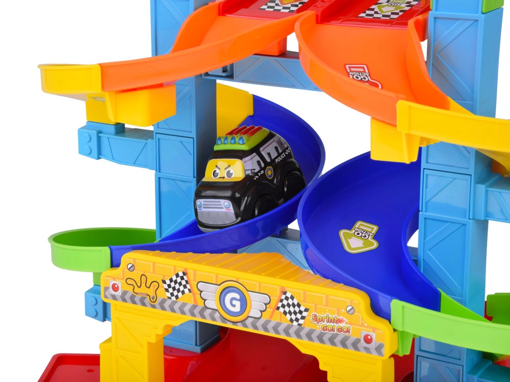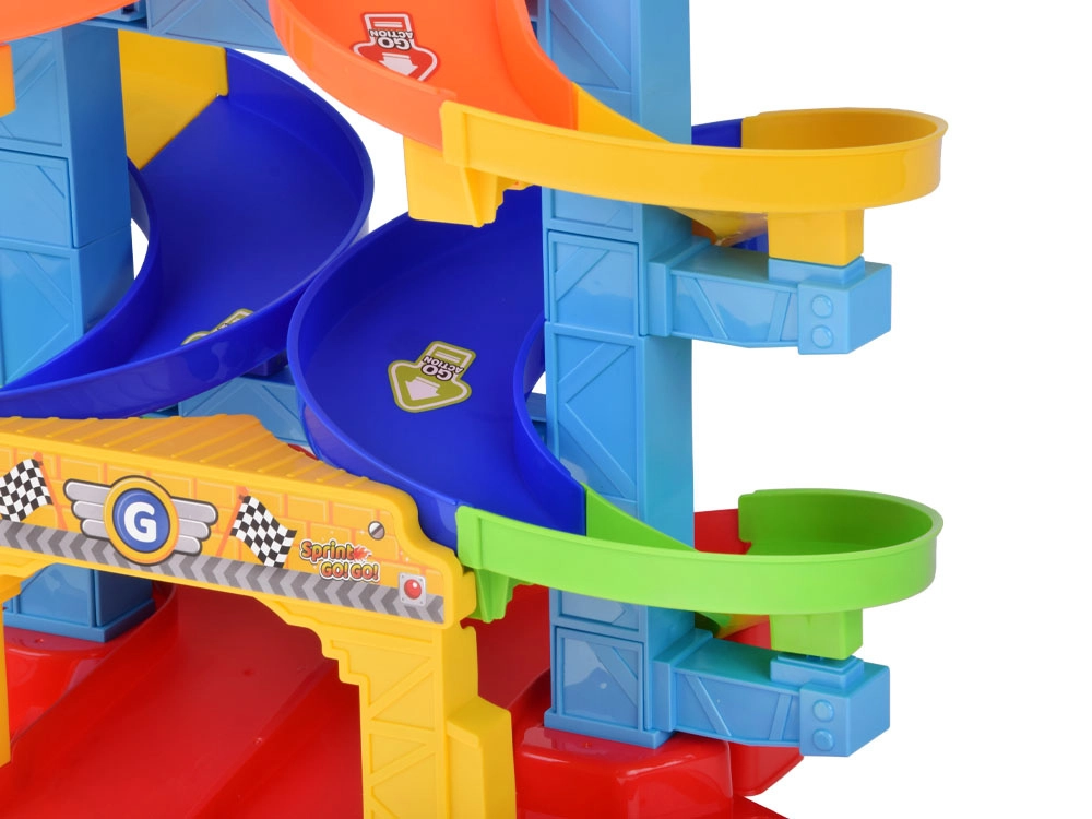 Le piste colorate a spirale guidano le macchinine in sicurezza verso il basso. Pilastri stabili e sponde larghe assicurano una corsa fluida senza inceppamenti.