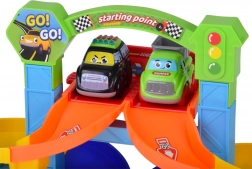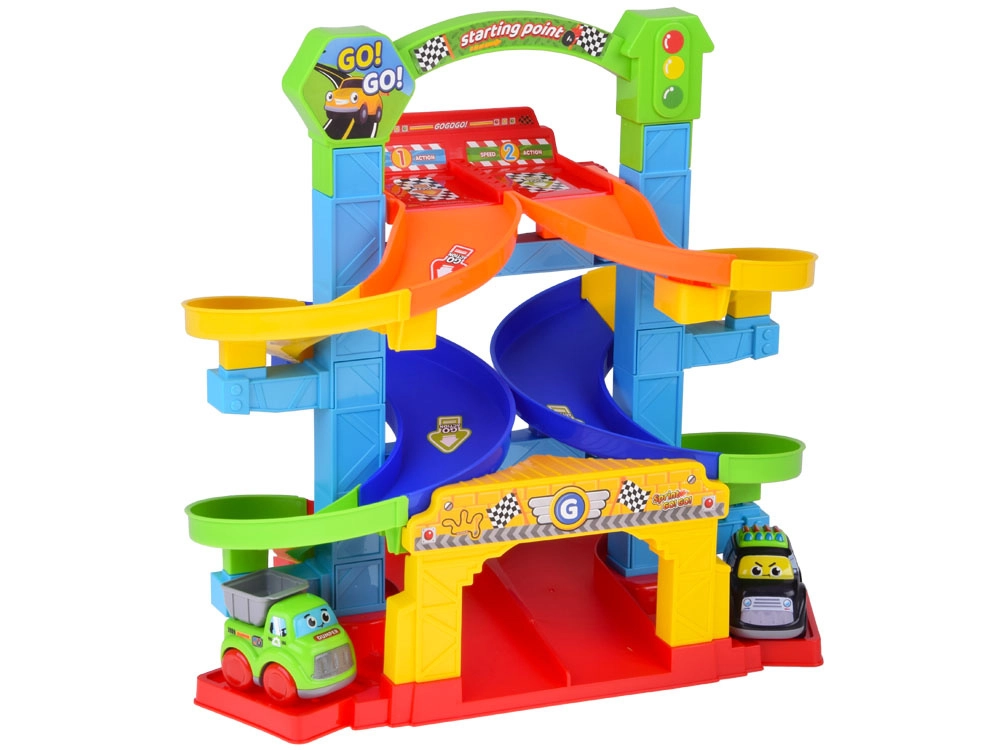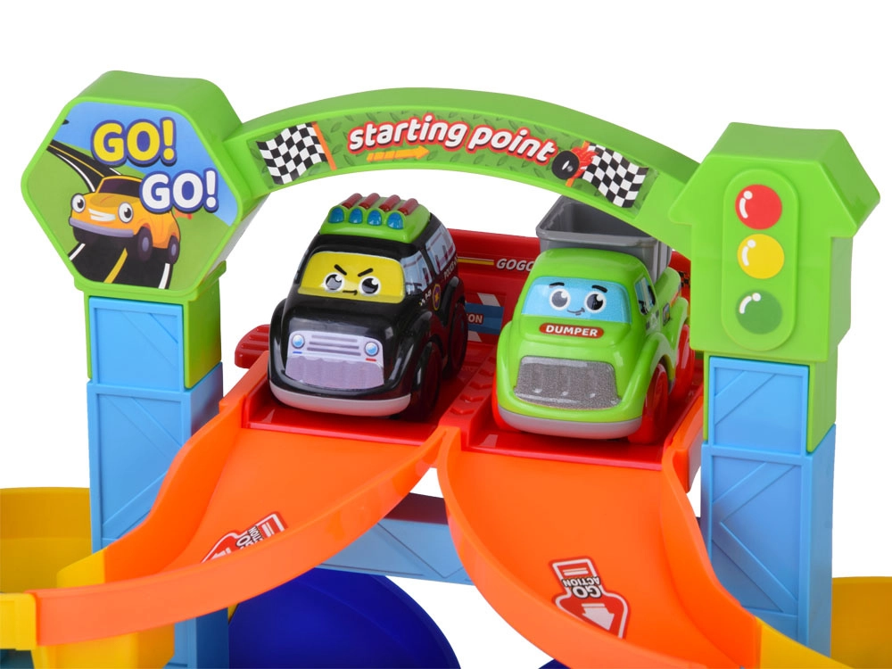La torre di partenza doppia con “starting point” e leva rilascia due macchinine contemporaneamente. I bambini si godranno una partenza emozionante e potranno gareggiare fianco a fianco.