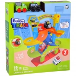 pista a spirale, porta di partenza, supporti, adesivi, 2 macchinine (polizia e camion ribaltabile)