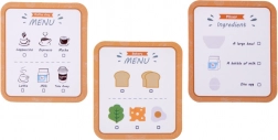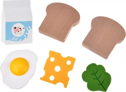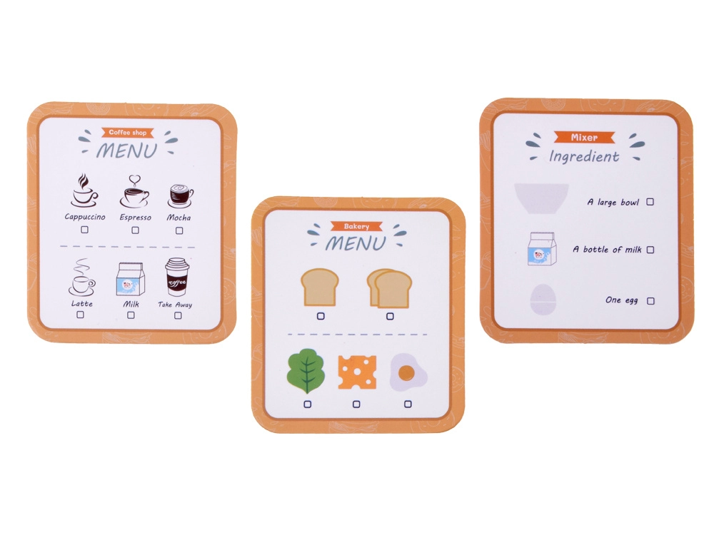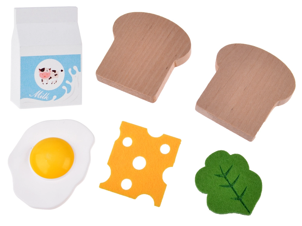 Inclusi tanti accessori: fette di pane in legno, uovo finto, fetta di formaggio, foglia di lattuga, cartoncino del latte, capsula di caffè e carte menu/ricette per un gioco ancora più divertente.