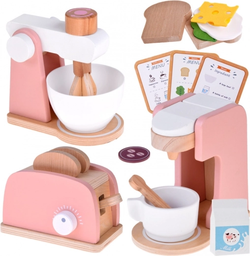 Un elegante set in legno di piccoli elettrodomestici porta la cucina dei bambini nel mondo della fantasia. Include un tostapane con leva e manopola girevole, una macchina del caffè con tazza, cucchiaino e capsula e un mixer da banco con ciotola e frusta rotante. Il legno naturale di qualità, le vernici atossiche e il design pastello garantiscono un gioco sicuro e bellissimo che sviluppa motricità fine, creatività e gioco di ruolo.