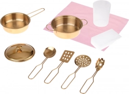 Incluso un set di pentolame e accessori per iniziare subito a giocare: pentola e casseruola in metallo con coperchio, mestolo, schiumarola, spatola, pinze per pasta, bicchiere in plastica, spugnetta e canovaccio rosa. Gli armadietti inferiori e le mensole offrono ampio spazio per riporre alimenti e accessori.