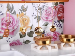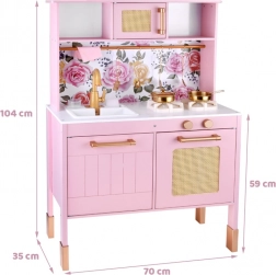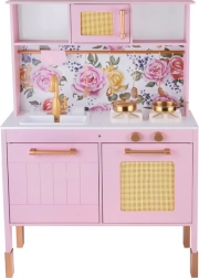 Questa cucina in legno dal gusto rétro, in delicato rosa, combina materiali resistenti con splendidi dettagli: maniglie dorate, sfondo floreale e gambe stabili. I bambini si divertiranno a imitare gli adulti grazie ai fornelli luminosi con effetto cottura e frittura, alle manopole girevoli con scatto e al lavello con rubinetto dorato.