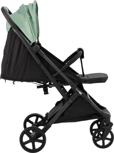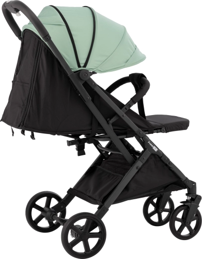 Il passeggino è dotato di ammortizzazione su tutte e quattro le ruote per una marcia fluida su marciapiedi e pavé, mentre il freno sulle ruote posteriori assicura stabilità in sosta. Il capiente cestello portaoggetti con portata fino a 3 kg contiene tutto il necessario per l’uscita. Le ruote removibili facilitano la pulizia e lo stoccaggio e il maniglione in materiale EVA è piacevole al tatto.
