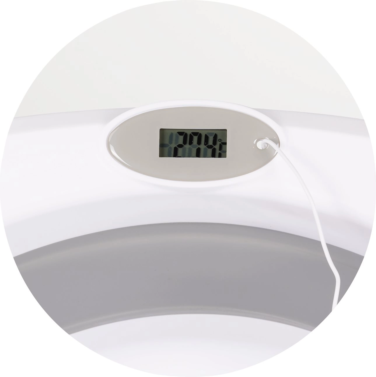Il termometro integrato aiuta a impostare la temperatura ideale dell’acqua. Il foro di scarico con pratico tappo velocizza lo svuotamento senza sollevare la vaschetta.