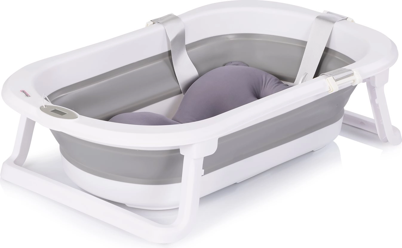 Pratica vaschetta per bambini CHIPOLINO Malibu nel raffinato colore grigio, offre un bagnetto sicuro e confortevole dal neonato al bimbo piú grande. Grazie al design pieghevole, allo stand in metallo all’altezza ergonomica e alla cuscinetta da bagno per il sostegno del neonato, il bagnetto è semplice, delicato sulla schiena dei genitori e sicuro. Non mancano termometro integrato, foro di scarico e elementi antiscivolo per la massima stabilità.