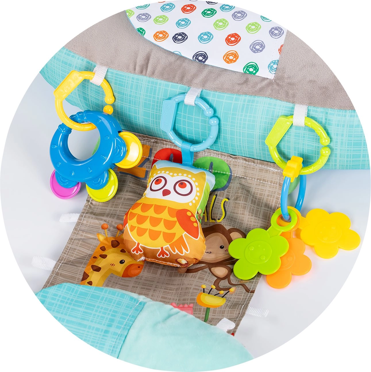 Anelli sospesi e morbidi giochini invogliano ad afferrare e scuotere, sostenendo la motricità fine e la percezione sensoriale.