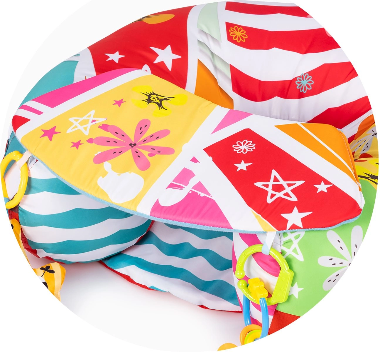 Grazie all’imbottitura morbida e stabile offre un sostegno sicuro, mentre i motivi colorati e gli elementi interattivi aiutano a sviluppare i sensi e la coordinazione occhio–mano. Il materiale pratico è facile da pulire, quindi è pronto per le avventure di ogni giorno.
