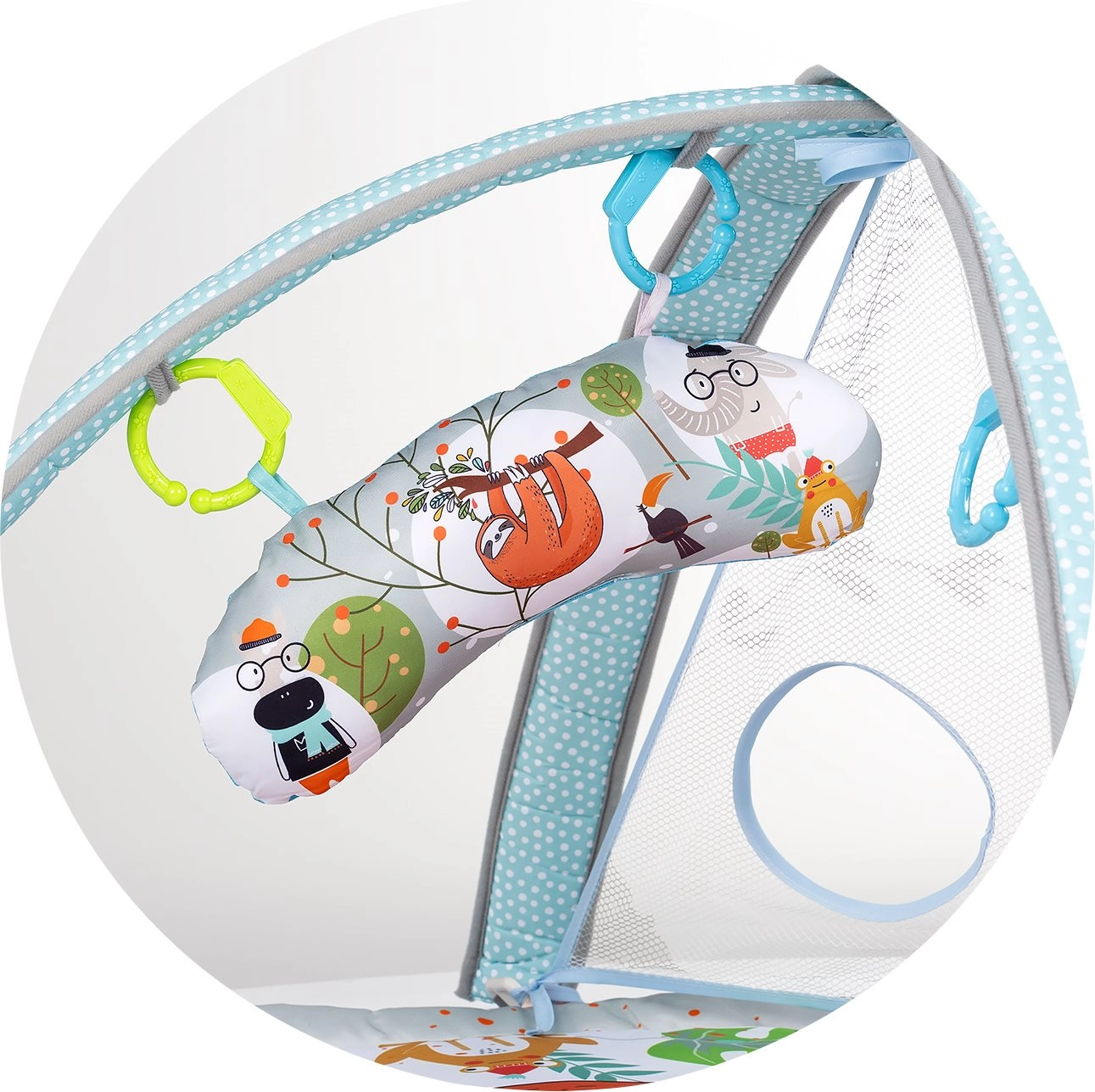 - tappetino morbido, archi rimovibili, giochini sospesi e specchietto, palline colorate in plastica