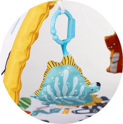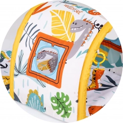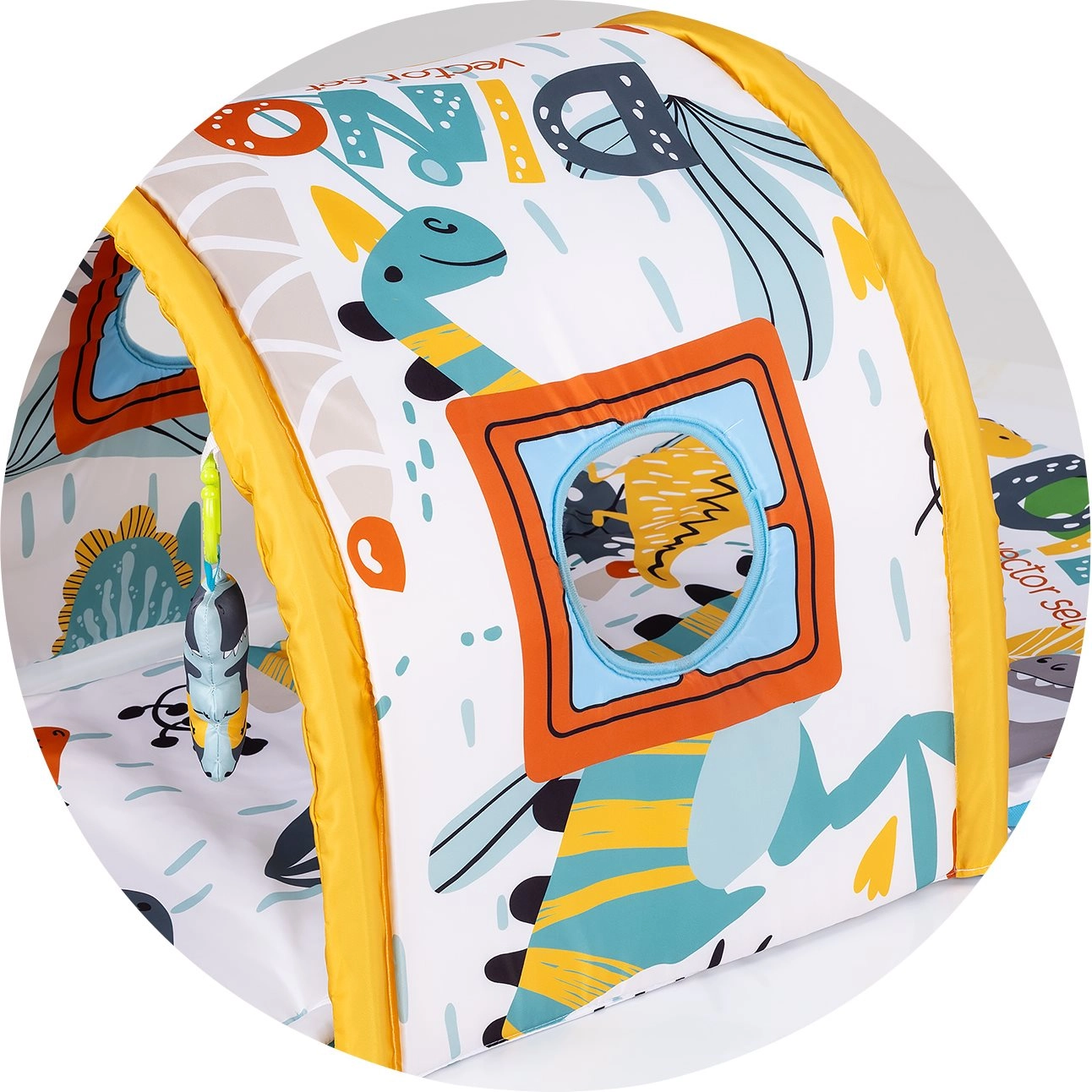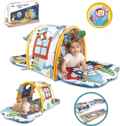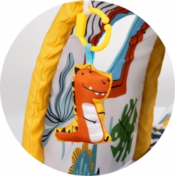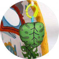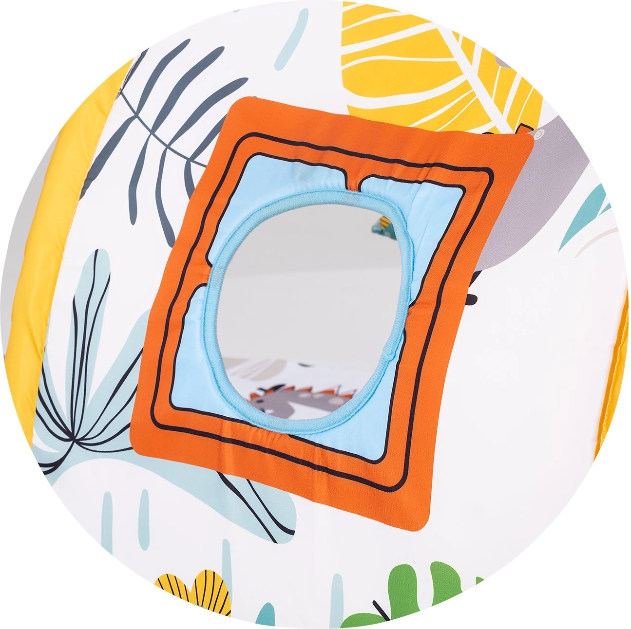 Grazie alla realizzazione sicura e confortevole, il tappeto offre un luogo piacevole per giocare sia a pancia in giù sia sulla schiena. Le finestrelle e i dettagli del tunnel invitano a sbirciare e a giocare a nascondino, sviluppando curiosità e immaginazione. Gli elementi colorati e le diverse texture offrono ricchi stimoli per il sviluppo sensoriale e le prime interazioni sociali con i genitori.