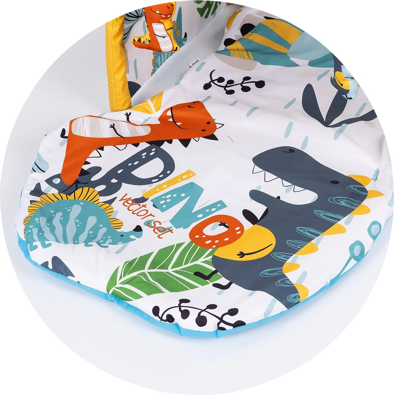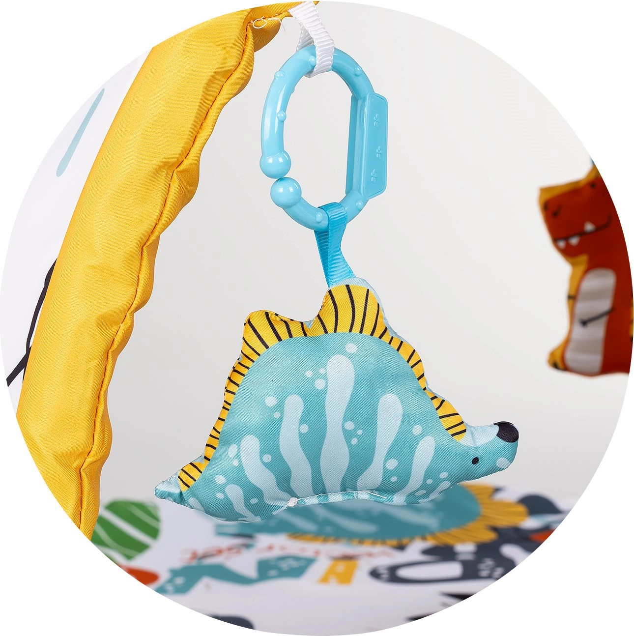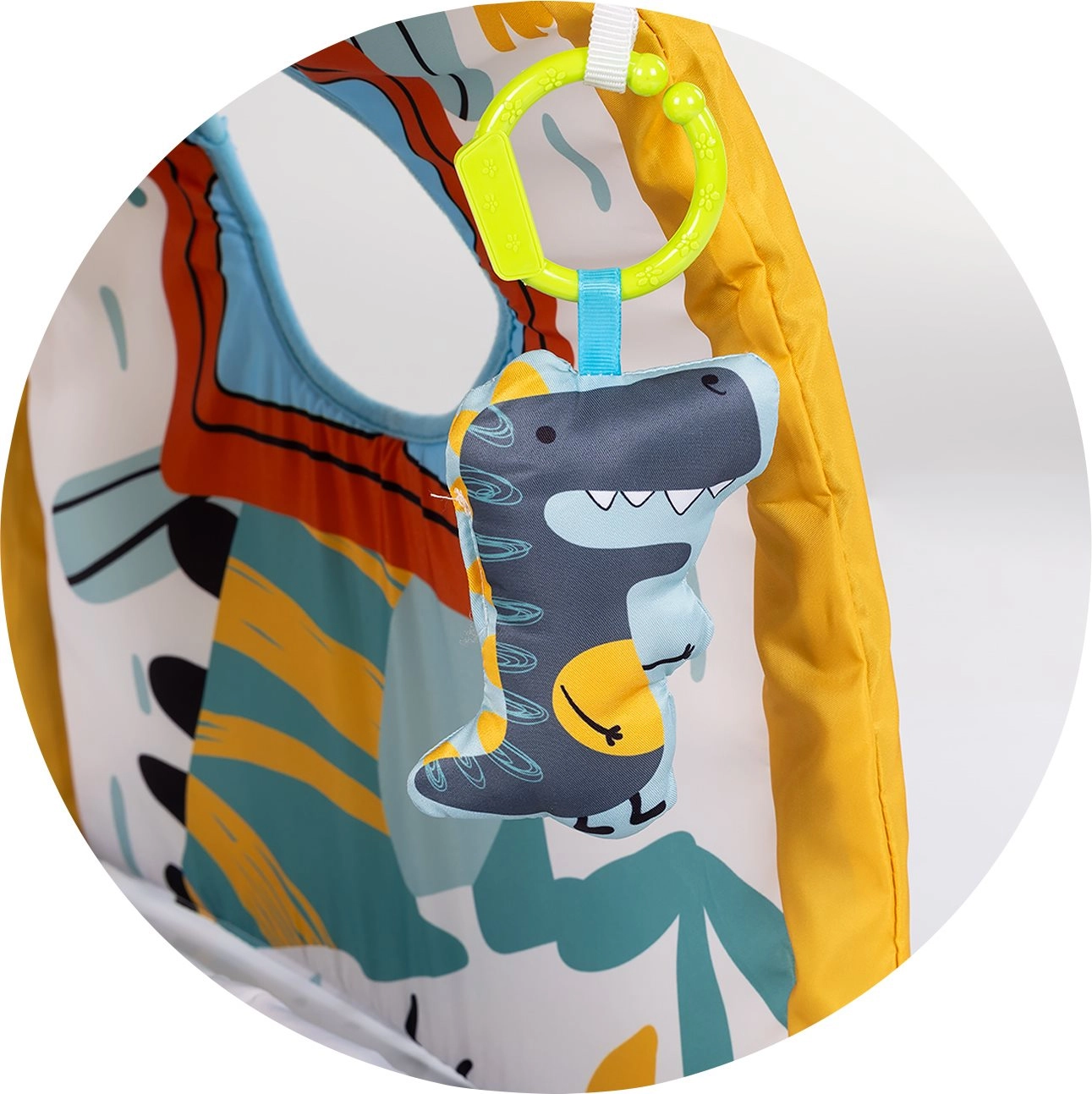 Il tappetino imbottito con arco e giochi appesi motiva il bebè ad afferrare e rinforza la coordinazione mano–occhio.