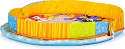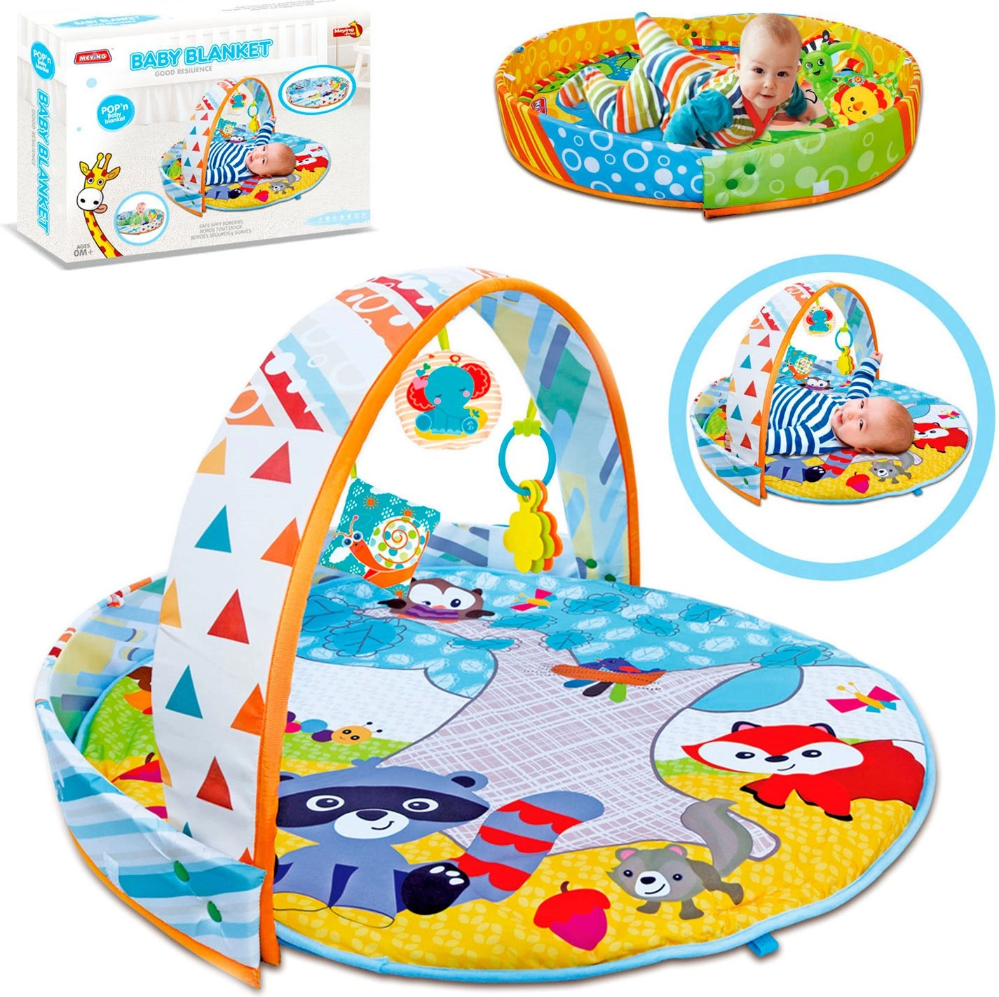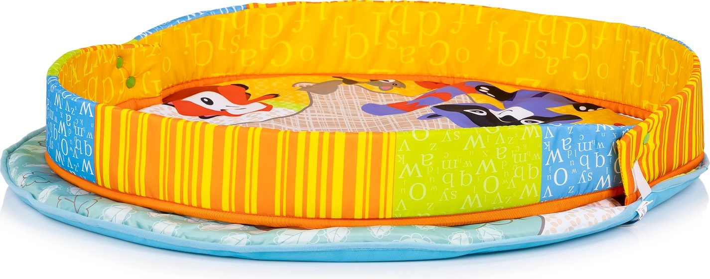 Inclusi cuscinetti morbidi in peluche, massaggiagengive, sonagli e elementi fruscianti che stimolano udito, vista e tatto. Il tappetino è perfetto per il tummy time (gioco a pancia in giù) e per il tranquillo osservare distesi sulla schiena. Grazie alla chiusura semplice si trasporta e si ripone con facilità.