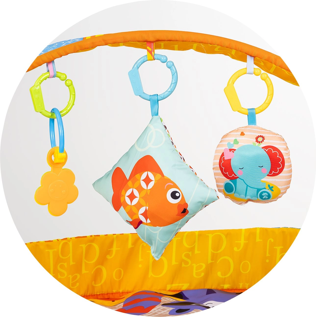 Due archi incrociati con giochi morbidi e in plastica, sonagli e massaggiagengive stimolano il bebè ad allungarsi e afferrare.